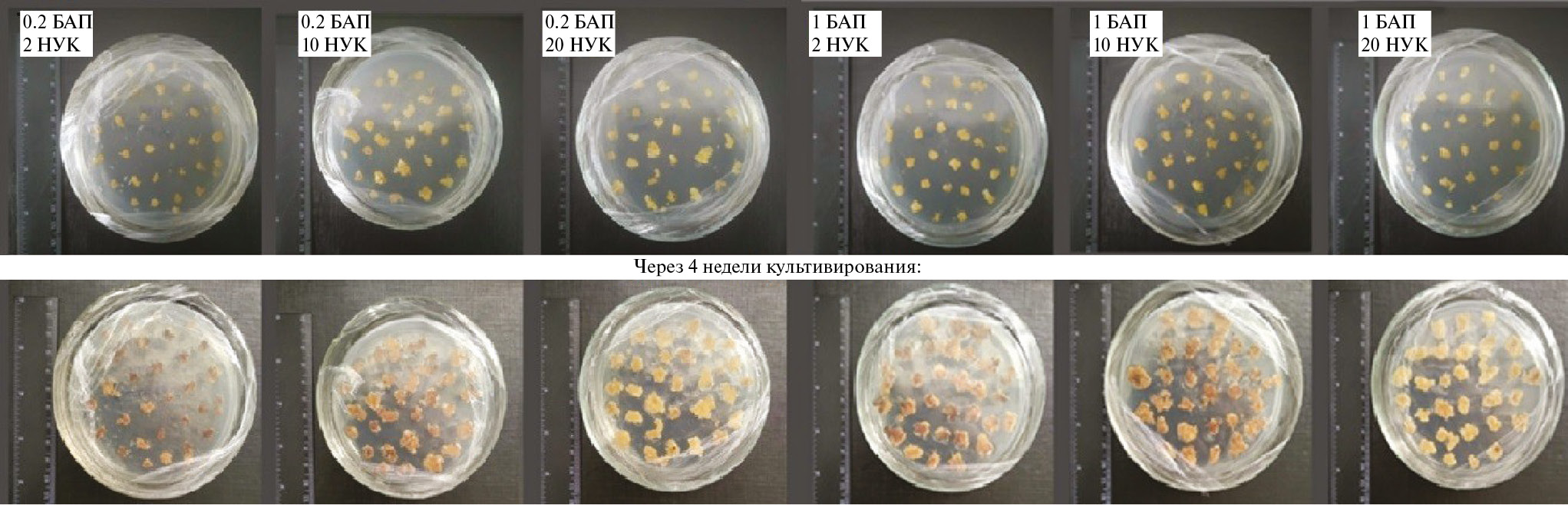 Лучший рост каллусов наблюдали в вариантах 1 мг/л БАП и 10 или 20 мг/л НУК. При таком соотношении фитогормонов в среде прирост каллусов на третью неделю пассирования сохранялся на том же уровне. Индекс роста каллусов для этих сочетаний фитогормонов существенно не отличался и составлял от 3.5 до 4.5. Это больше, чем, например, в варианте с той же концентрацией БАП (1 мг/л), но меньшей концентрацией НУК (2 мг/л), где индекс роста каллусов составлял около 2.7.