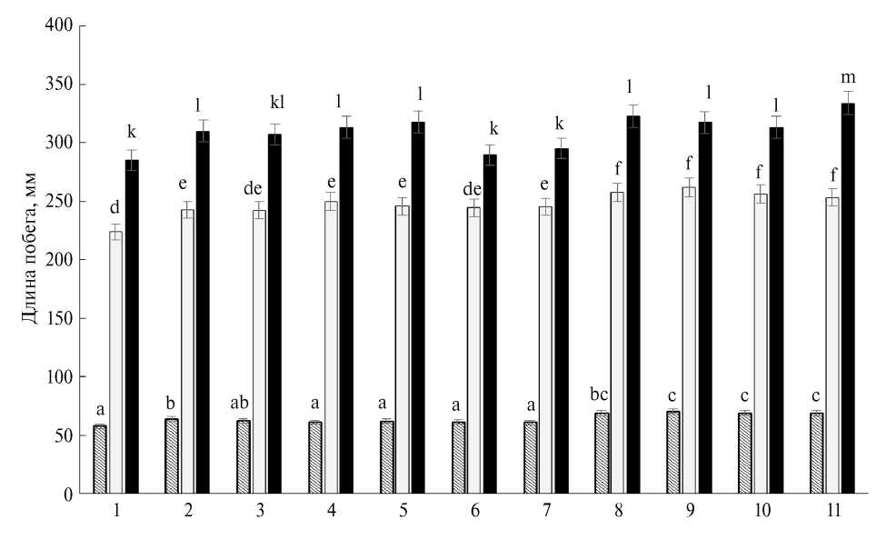 Рис. 1. Влияние 24-эпибрассинолида (ЭБ), 24-эпикастастерона (ЭК), феруловой кислоты (ФК) и их смесей на рост растений яровой пшеницы на 7 (столбики со штриховкой), 14 (светлые столбики) и 21 (черные столбики) сутки от начала обработки семян растворами веществ. 1 – контроль (вода); 2 – ЭБ, 10–9 М; 3 – ЭБ, 10–7 М; 4 – ЭК, 10–9 М; 5 – ЭК, 10–7 М; 6 – ФК, 10–9 М; 7 – ФК, 10–7 М; 8 – ЭБ+ФК, 10–9 М; 9 – ЭБ+ФК, 10–7 М; 10 – ЭК+ФК, 10–9 М; 11 – ЭК+ФК, 10–7 М. Достоверные различия на уровне P ≤ 0.05 отмечены разными буквами.