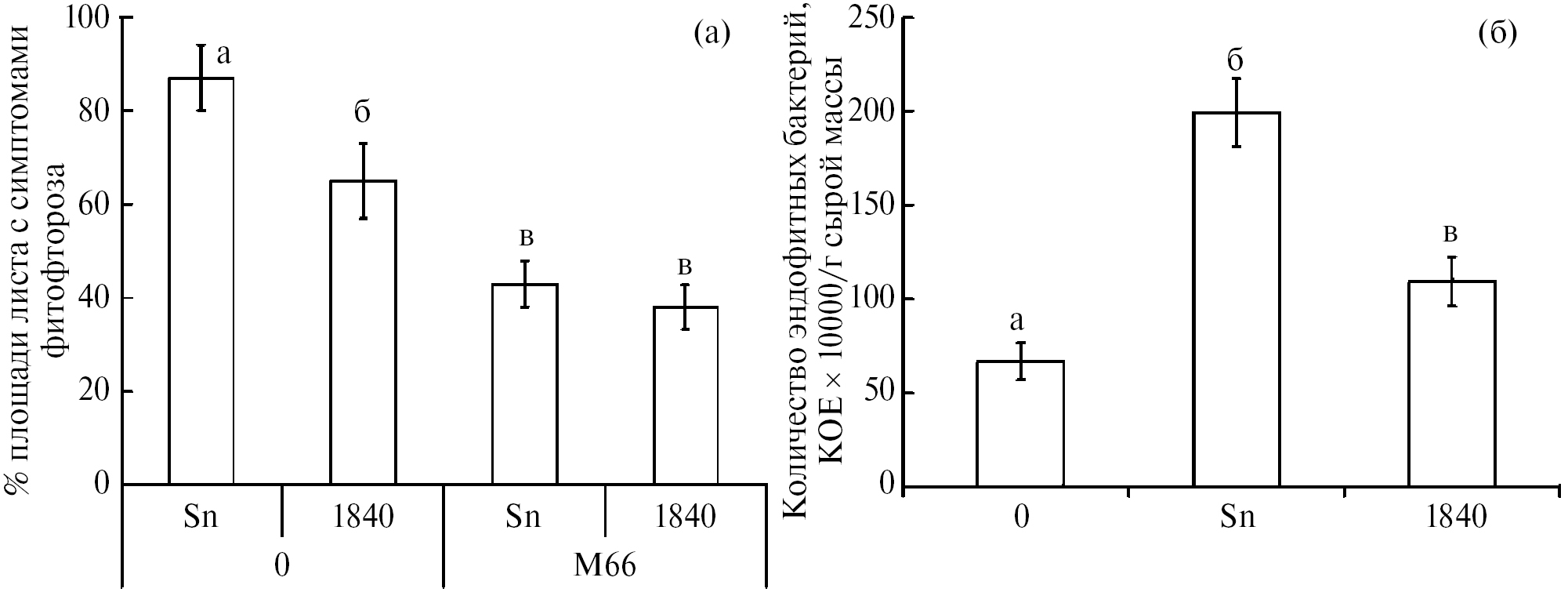Рис. 1. Процент площади листовой пластинки с видимыми симптомами фитофтороза на растениях картофеля под влиянием бактерий Bacillus velezensis M66 на 8 сутки после нанесения спор патогена (а); количество КОЕ эндофитных бактерий B. velezensis M66 в тканях картофеля через 24 ч после инфицирования возбудителем фитофтороза (б). 0 – неинфицированные растения. Разными буквами обозначены варианты, показавшие статистически значимые отличия друг от друга (P ≤ 0.05).