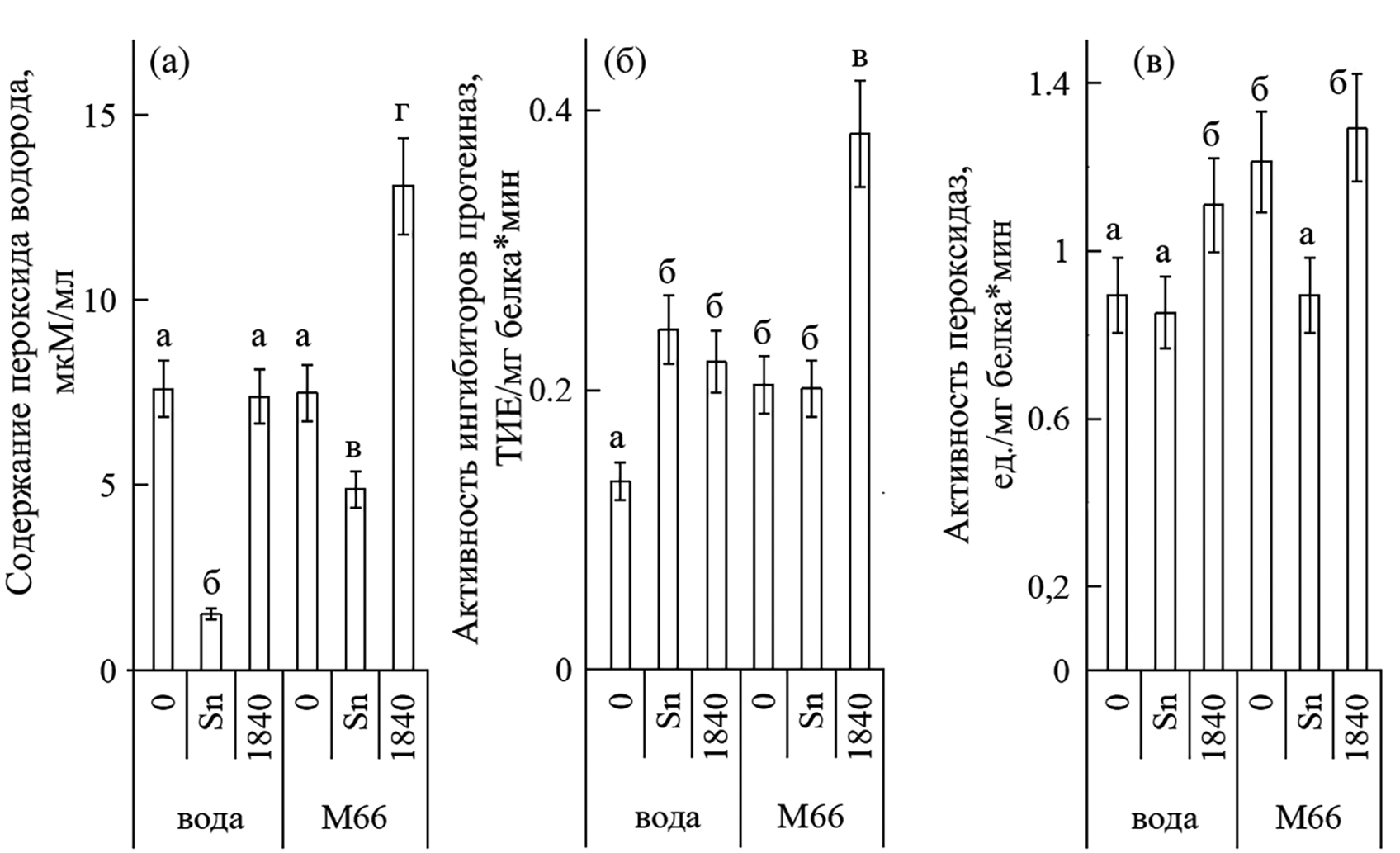 Рис. 2. Влияние бактерий Bacillus velezensis M66 на содержание пероксида водорода (а), активность ингибиторов трипсина (б) и пероксидаз (в) в здоровых и инфицированных штаммами возбудителя фитофтороза Phytophthora infestans 1840 и P. infestans Sn растениях картофеля через 24 ч после инфицирования. Разными буквами обозначены варианты, показавшие статистически значимые отличия друг от друга (P ≤ 0.05).