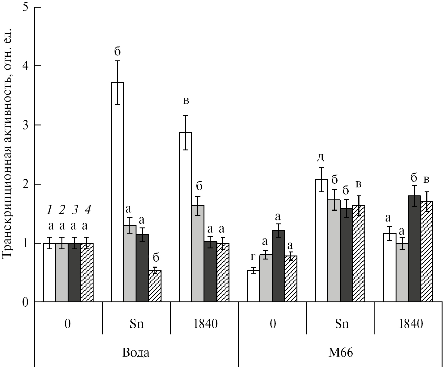 Рис. 3. Влияние бактерий Bacillus velezensis M66 на относительное количество транскриптов генов ингибитора трипсина StPR6 (1), основного защитного белка – индикатора развития системной приобретенной устойчивости StPR1 (2), хитиназы StPR2 (3) и анионной пероксидазы StPR9 (4) в здоровых и инфицированных штаммами возбудителя фитофтороза Phytophthora infestans 1840 и P. infestans Sn растениях картофеля (24 ч после нанесения спор патогена). Транскрипционная активность каждого исследуемого гена нормализована относительно референсного гена актина картофеля. Разными буквами обозначены варианты, показавшие статистически значимые отличия друг от друга (P ≤ 0.05). Сравнение производилось для каждого конкретного гена в отдельности.