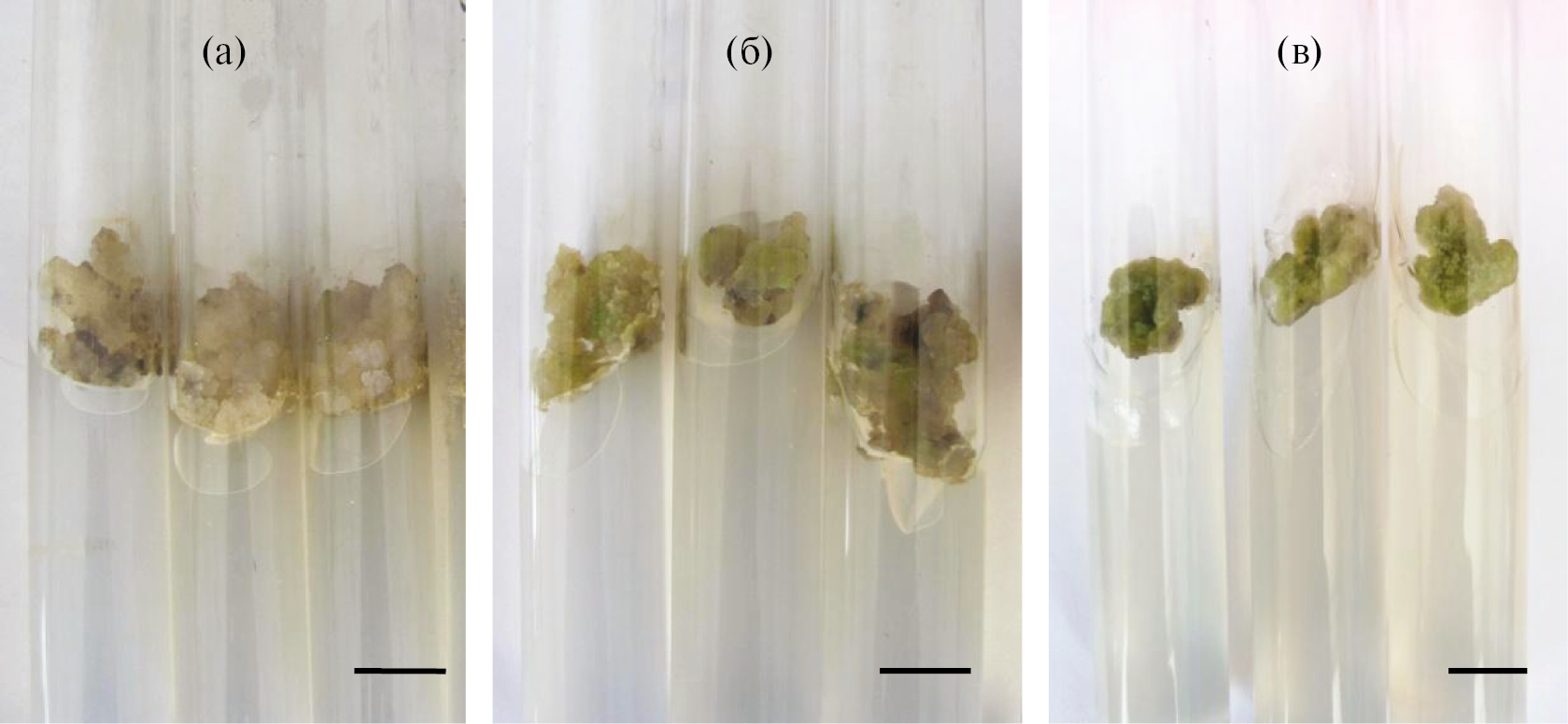 Для введения в асептическую культуру в качестве эксплантов использовали высечки листовых пластинок (5 × 5 мм) донорных растений, а также сегменты гипокотилей и семядолей (4 × 5 мм) проростков in vitro. Исходный растительный материал (листья, семена) предварительно промывали в мыльном растворе 20 мин, ополаскивали в проточной воде 5–7 мин, а затем стерилизовали в течение 1 мин в 70% этаноле и 6 мин в 50% растворе препарата Брадофен 10Н (Florin, Венгрия) и трижды промывали стерильной дистиллированной водой. Все работы по введению в культуру и пассированию каллусов выполняли в условиях ламинарного бокса БАВнп-01-“Ламинар-С”-1,2 (Lamsystems, Россия).