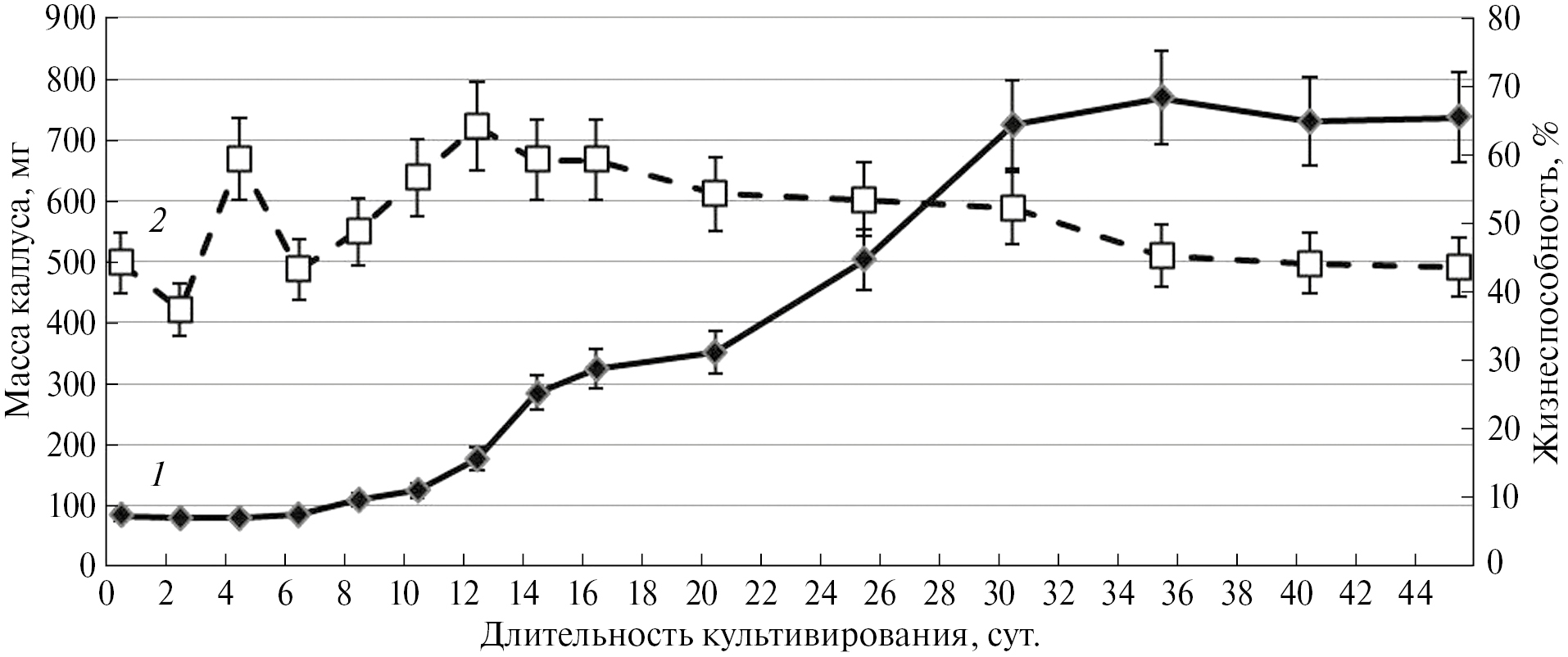 Для исследования цитофизиологических характеристик использовали каллусы девятого пассажа, полученные из эксплантов гипокотиля. Анализ цитофизиологических параметров популяции каллусных клеток в цикле выращивания проводили на 0, 2, 4, 6, 8, 10, 12, 14, 16, 20, 25, 30, 35, 40, 45 сут. культивирования. Массу сырого каллуса оценивали на основании взвешивания не менее 20 индивидуальных каллусов. Удельную скорость роста (μ) определяли по формуле [23]: