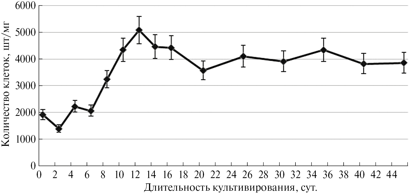 Данные об изменении массы и плотности каллуса, жизнеспособности клеточной популяции и соотношения разных типов клеток на протяжении 45 сут. культивирования представлены на рис. 4–7. Кривые роста массы каллуса представлены в обычной (рис. 4) и полулогарифмической системе координат (рис. 5), что позволяет более точно определить динамику изменения ростовых характеристик и выделить фазы роста в цикле выращивания.
