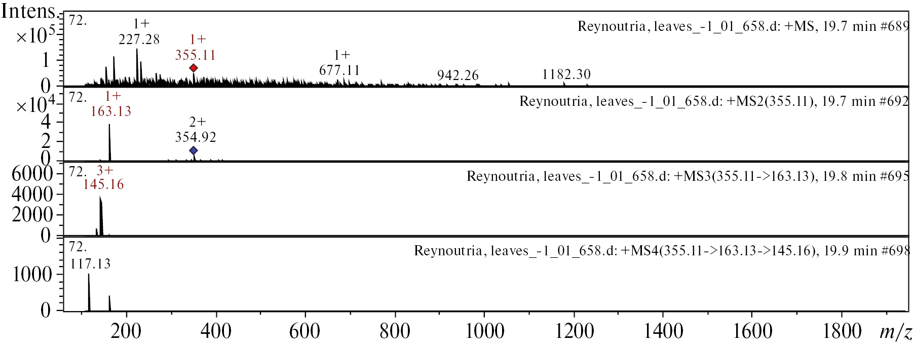 Рис. 2. Масс-спектр хлорогеновой кислоты из экстракта листьев Reynoutria japonica. Вверху МС-скан в диапазоне 100–1700 m/z, внизу спектры фрагментации (сверху-вниз): МС2 протонированного иона хлорогеновой кислоты (355.11 m/z, красный ромб), МС3 фрагмента 355.11→163.13 m/z и МС4 фрагмента 355.19→163.13→145.16 m/z.
