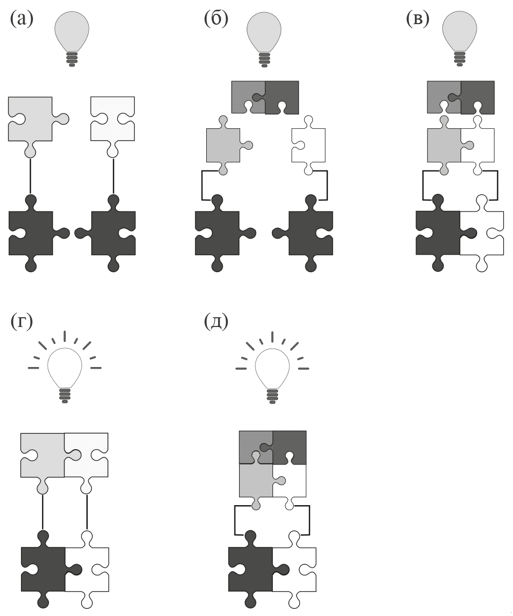 Рис. 3. Схема белок-белковых взаимодействий с использованием бимолекулярного флуоресцентного анализа комплементации (BiFC) и трехсторонней системы комплементации: (a, б) – cистема BiFC включает два взаимодействующих белка, каждый из которых имеет транскрипционно-трансляционное слияние с одним из белковых доменов флуоресцентного белка (а), за счет совместного сворачивания флуоресцентного белка в структуру β-бочонка в случае взаимодействия целевых белков, что приводит к восстановлению флуорофора (г). (б, в, д) – трехсторонняя система комплементации включает два фрагмента GFP, каждый из которых имеет транскрипционно-трансляционное слияние с одним из исследуемых белком-партнером, и дополнительную систему с дополнительными фрагментами GFP (б), при белок-белковом взаимодействии (в) дополнительные фрагменты GFP взаимодействуют с фрагментами GFP, которые слиты с белками-партнерами, что приводит к восстановлению полноразмерного GFP, который флуоресцирует (д). Принцип использования систем более подробно описан в тексте.