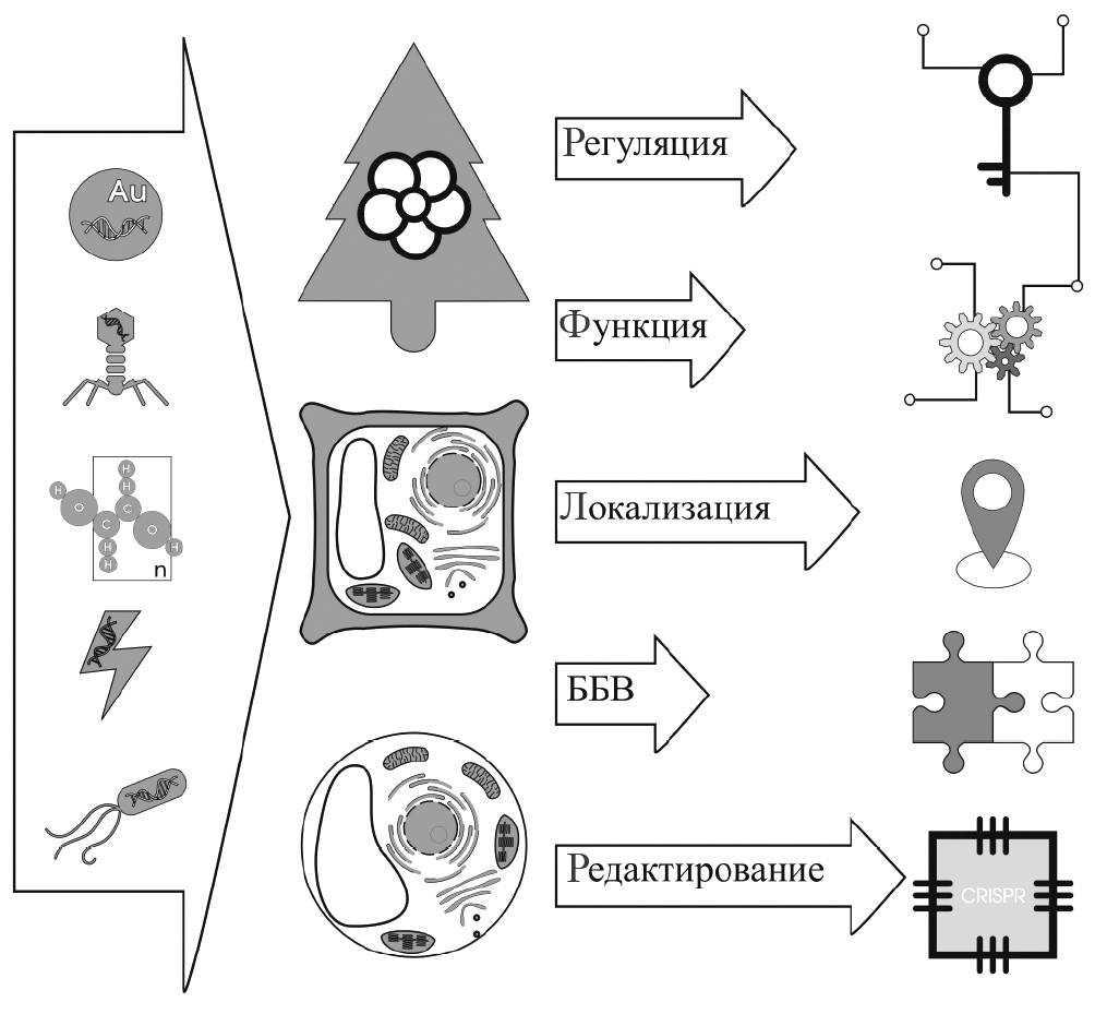 Рис. 4. Основные направления исследований с использованием транзиентной экспрессии генов в растениях. Доставка генных конструкций в растительные системы с использованием разных методических подходов расширяет экспериментальные возможности исследователей в области функциональной геномики растений. ББВ – белок-белковое взаимодействие.