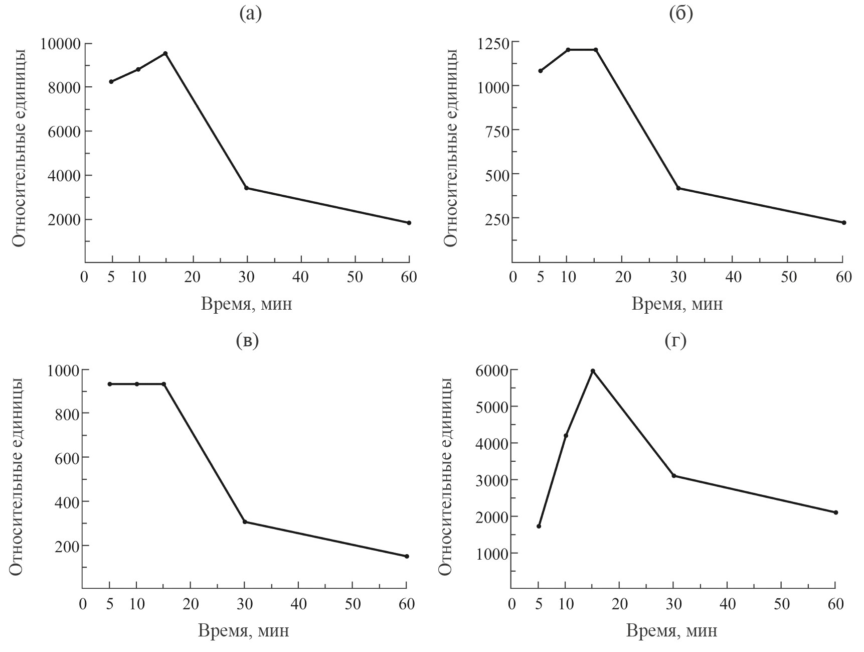 Рис. 5. Относительная скорость выделения оксилипинов HPL ветви, цис-3-гексеналя (а), транс-2-гексеналя (б), цис-3-гексенола (в) и цис-3-гексенил ацетата (г), механически поврежденным листом мягкой пшеницы Саратовская-60 в течение часа после повреждения. Данные репрезентативного эксперимента представлены как площадь хроматографического пика соответствующего метаболита, разделенная на время улавливания метаболитов, выделяемых поврежденным листом.
