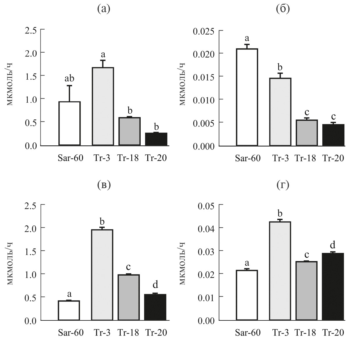 Рис. 3. Содержание индивидуальных оксилипинов HPL ветви, цис-3-гексеналя (а), транс-2-гексеналя (б), цис-3-гексенола (в) и цис-3-гексенил ацетата (г), в интактных листьях мягкой пшеницы Саратовская-60 (Sar-60, белые столбцы) и листьях трансгенных линий с конститутивной экспрессией гена AtOPR3 (Tr-3, Tr-18 и Tr-20, закрашенные столбцы). Буквы обозначают статистически значимые различия между линиями, согласно оценке однофакторного дисперсионного анализа (ANOVA) с последующим пост-хок тестом Тьюки (Р ≤ 0.05).