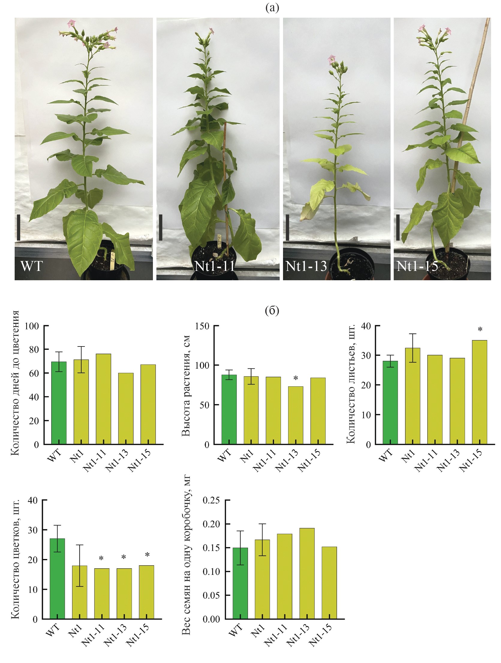 Рис. 2. Трансгенные линии Nicotiana tabacum (Nt1-11, Nt1-13 и Nt1-15) с мозаично нокаутированным геном пластидной крахмалфосфорилазы NtPHO1-L1 в сравнении с нетрансгенным контролем (WT): (а) ‒ фотографии растений WT, Nt1-11, Nt1-13 и Nt1-15 на стадии цветения (масштаб 10 см); (б) ‒ сравнение основных характеристик контрольных (WT, среднее по 20 растениям) и редактированных линий Т1 от Nt1 (среднее по 20 растениям Nt1-1–Nt1-20; далее по графику даны индивидуальные значения для каждого из анализируемых растений Nt1-11, Nt1-13 и Nt1-15). *Р < 0.05 – статистически значимое различие Т1 от Nt1 vs. WT.