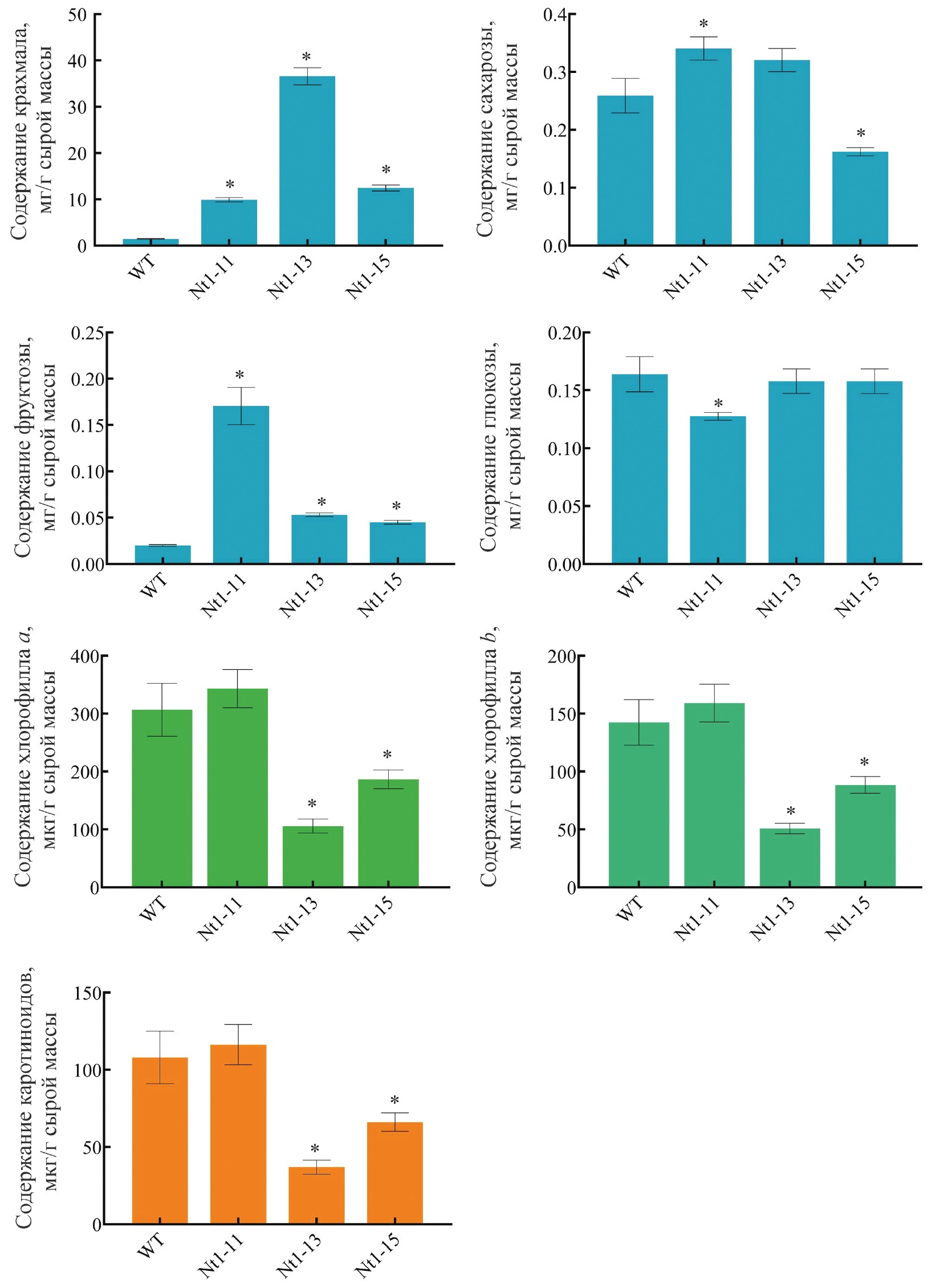 Рис. 3. Содержание крахмала, сахарозы, глюкозы, фруктозы (мг/г сырой массы), суммы каротиноидов и хлорофиллов a и b (мкг/г сырой массы) в листовой ткани растений Nt1-11, Nt1-13 и Nt1-15 в сравнении с нетрансгенным контролем WT. *Р < 0.05 – статистически значимое различие Т1 от Nt1 vs. WT.