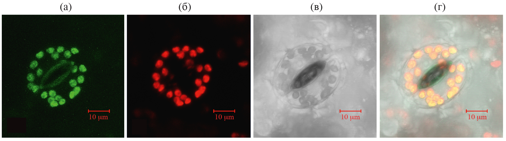 Рис. 4. Детекция рекомбинантного eGFP с помощью конфокальной микроскопии на примере замыкающих клеток устьиц в листьях табака. а – флуоресценция eGFP в хлоропластах; б – автофлуоресценция хлоропластов; в – фазовый контраст; г – совмещение. Масштабная линейка: 10 мкм.