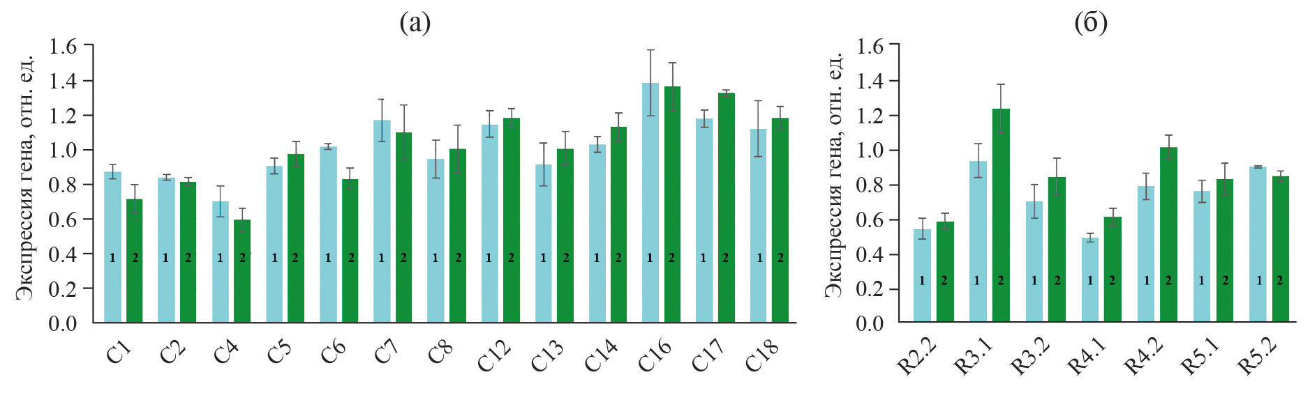 Рис. 6. Уровень экспрессии генов aadA и egfp в составе генетической конструкции pPlastEx_GFP в пластидах транспластомных растений по накоплению матричной РНК. а – растения поколения Т1; б – растения регенеранты поколения R2; синий цвет (1) – aadA; зеленый цвет (2) – egfp; отн. ед. – относительные единицы.