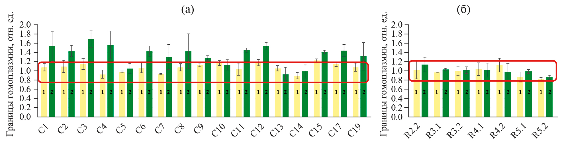 Рис. 7. Определение гомоплазмии транспластомных растений. а – в транспластомных растениях Т1 поколения; б – в транспластомных растениях-регенерантах R2: желтый цвет (1) – ген aadA; зеленый цвет (2) – ген egfp; красная рамка – границы гомоплазмии; отн. ед. – относительные единицы.