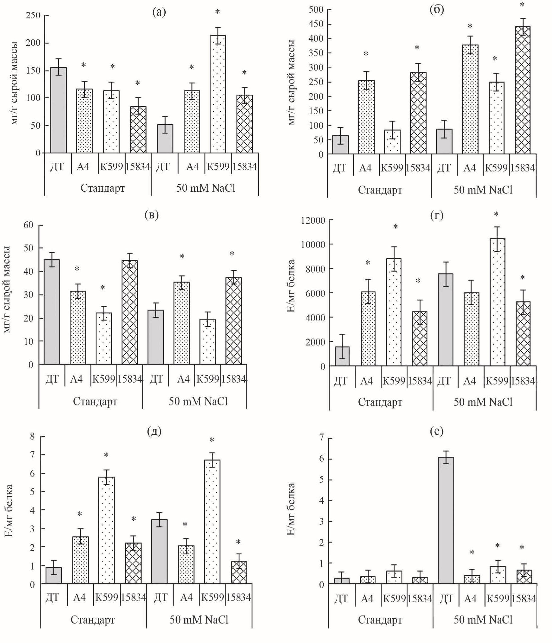 Активность ГПОК (рис. 5д) в корнях всех трансгенных линий в нормальных условиях была выше, чем у растений ДТ в среднем в растениях А4 – в 2.9 раза, 15834 – в 2.5 раза и К599 – в 6.5 раза. При засолении активность ГПОК в корнях растений линий А4 и 15834 достоверно снижалась в среднем в 1.3 и 1.8 раза соответственно, и была ниже по сравнению с ДТ у линий А4 – в 1.7 раза и 15834 – в 2.8 раза, а в корнях растений линий К599 повысилась в среднем в 1.2 раза, превысив значение ДТ в среднем в 1.9 раза.