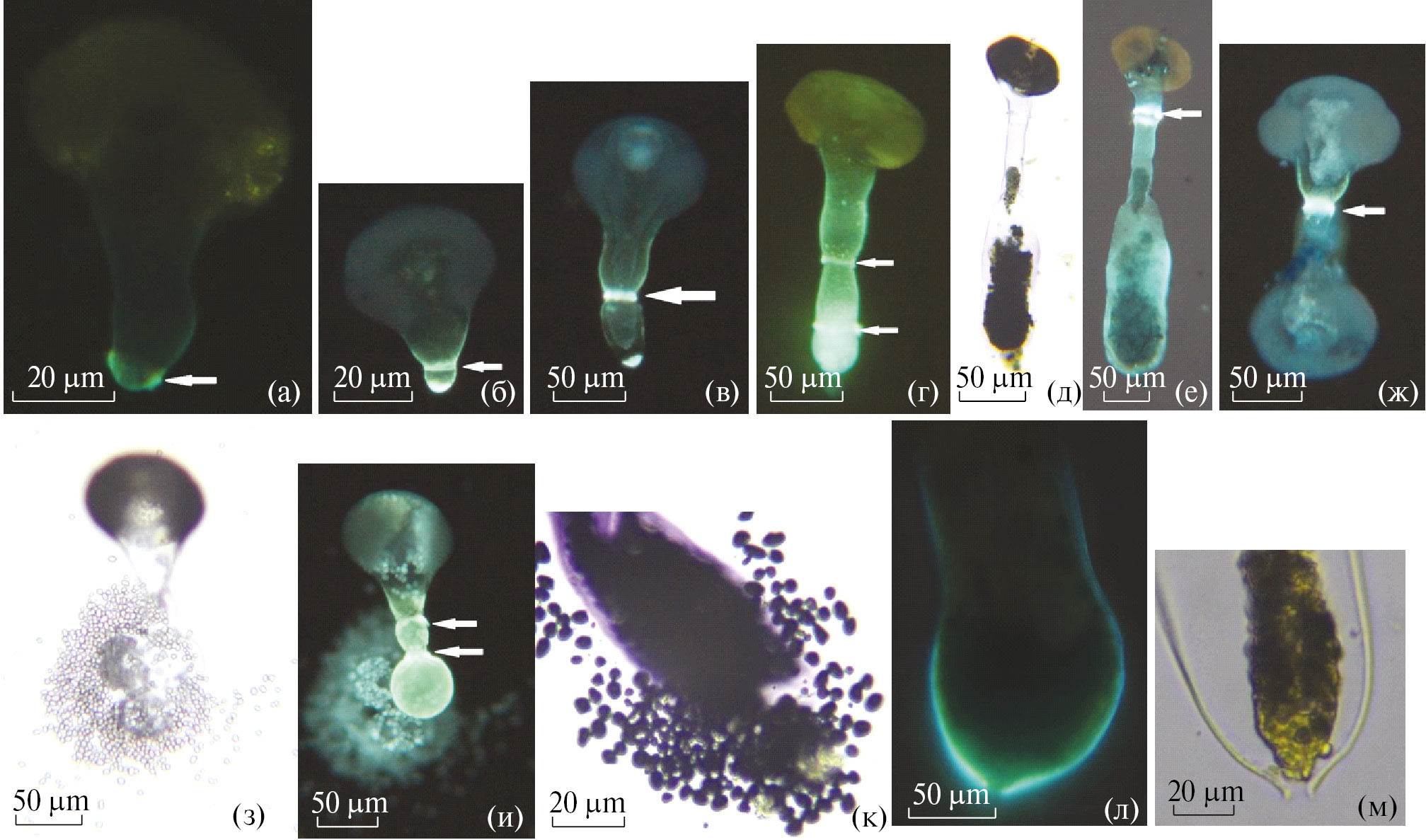 Рис. 6. Локализация каллозы в растущих пыльцевых трубках ели (а, б, в, г, д, е), характер разрушения наружных мембран, стенок и кончиков трубок при избыточном тургорном давлении (ж, з, и, к), расхождение боковых стенок на кончиках трубок (л, м). Окрашивание: а, б, в, г, ж, з, и, л ‒ анилиновым синим; д, е, к ‒ анилиновым синим – J2KJ; м ‒ J2KJ. Флуоресценция в ультрафиолетовом (а, б, в, г, е, ж, и, л) и проходящем белом свете (д, з, к, м), д-е, з-и – парные рисунки (левые – проходящий белый свет, правые – флуоресценция). Стрелками показана локализация колец каллозы.