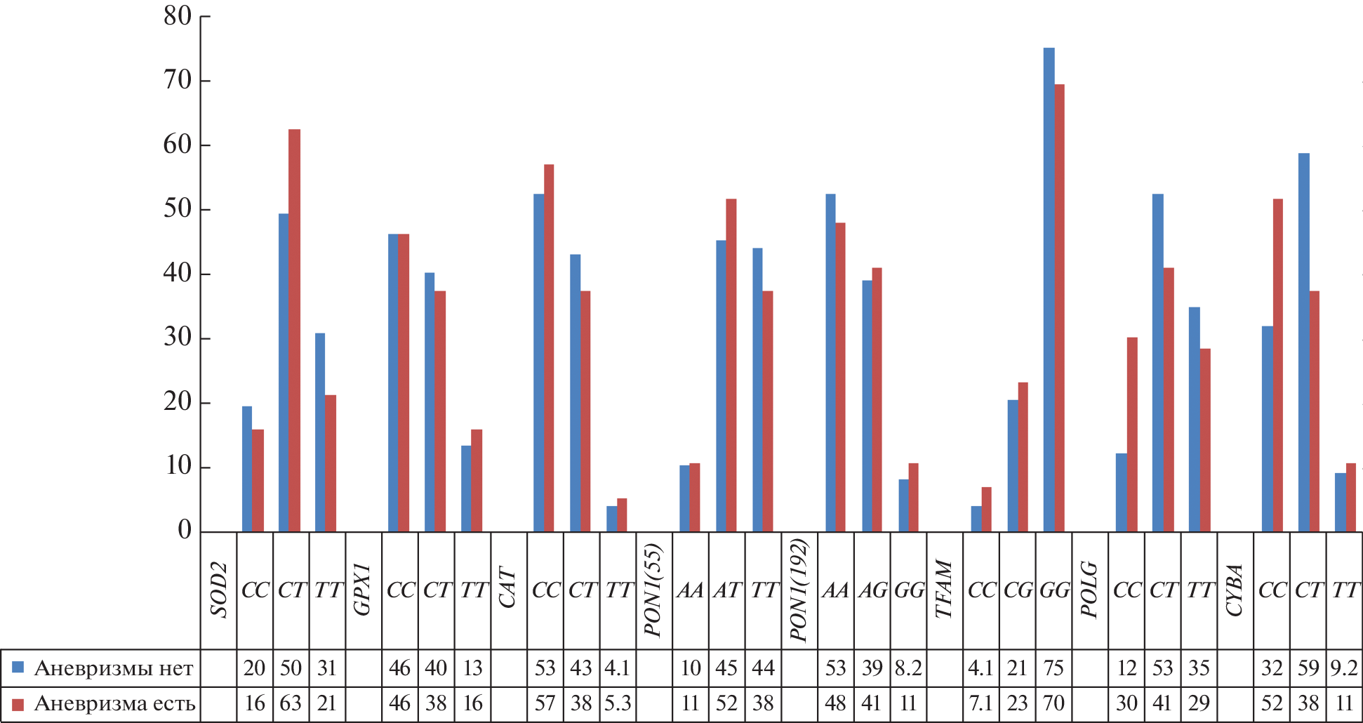 Studied the relationship of the polymorphic variant of the mitochondrial DNA polymerase gamma gene (POLG rs2238296) in combination with single-nucleotide polymorphic variants of the genes of the antioxidant system of the body (mitochondrial transcription factor A (TFAM rs1937), superoxide dismutase (SOD2 rs4880), glutathione peroxidase (GPX1 rs1050450), catalase (CAT rs1001179), paraoxonase 1 (PON1 rs854560) and NADP-H oxidase (CYBA rs4673)) with features of postinfarction remodeling of the left ventricle (LV). One hundred and fifty-three patients with coronary heart disease (137 men and 16 women) aged 56 (50; 60.5) years were examined. Genotyping was carried out using a polymerase chain reaction followed by analysis of the polymorphism of the lengths of restriction fragments. No significant difference was found in the SOD2, GPX1, CAT, PON1, TFAM genes in the studied groups. Significant differences were found with respect to the POLG and CYBA genes: the CC rs2238296 genotype of the POLG gene was found in every third patient with LV aneurysm (30.3%), where as in the group without aneurysm – only in every eighth case (12.3%, p = 0.006). The CC rs4673 genotype of the CYBA gene was found in every second patient with an aneurysm (51.8%) and in 32% without LV aneurysm (p = 0.01). Patients with a combination of CC (POLG) and CC (CYBA) genotypes were represented exclusively by younger men, who were characterized by a less burdened comorbid background, in comparison with patients with a different genotype of these genes. At the same time, the LV ejection fraction in such patients was significantly lower (40 (27; 52) and 50 (40; 61), p = = 0.006), and the development of LV aneurysm was recorded in 73% of cases.