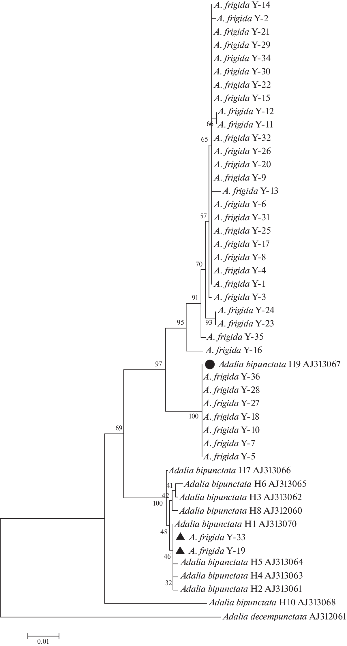 The haplotype diversity of mtDNA of the circumpolar species of ladybirds Adalia frigida collected in Yakutsk and Salekhard was studied. Based on the analysis of the nucleotide sequences of the cox1 gene, 18 mitochondrial haplotypes were identified, of which 14 were new. Of the 18 haplotypes of A. frigida, two (H32 and H9) are the most common. In the Salekhard region, the range of A. frigida overlaps with that of another closely related species, A. bipunctata. The value of divergence in the cox1 gene between A. frigida and A. bipunctata reaches 4.1–4.3% and corresponds to the level of differences characteristic of closely related species. These species are able to interbreed, the share of hybrid individuals (A. frigida and A. bipunctata) in Salekhard is 56.5%. Hybridization between A. frigida and A. bipunctata led to mutual mitochondrial introgression, which resulted in the acquisition of the H1 haplotype by the A. frigida beetles and the H9 haplotype by the A. bipunctata beetles.