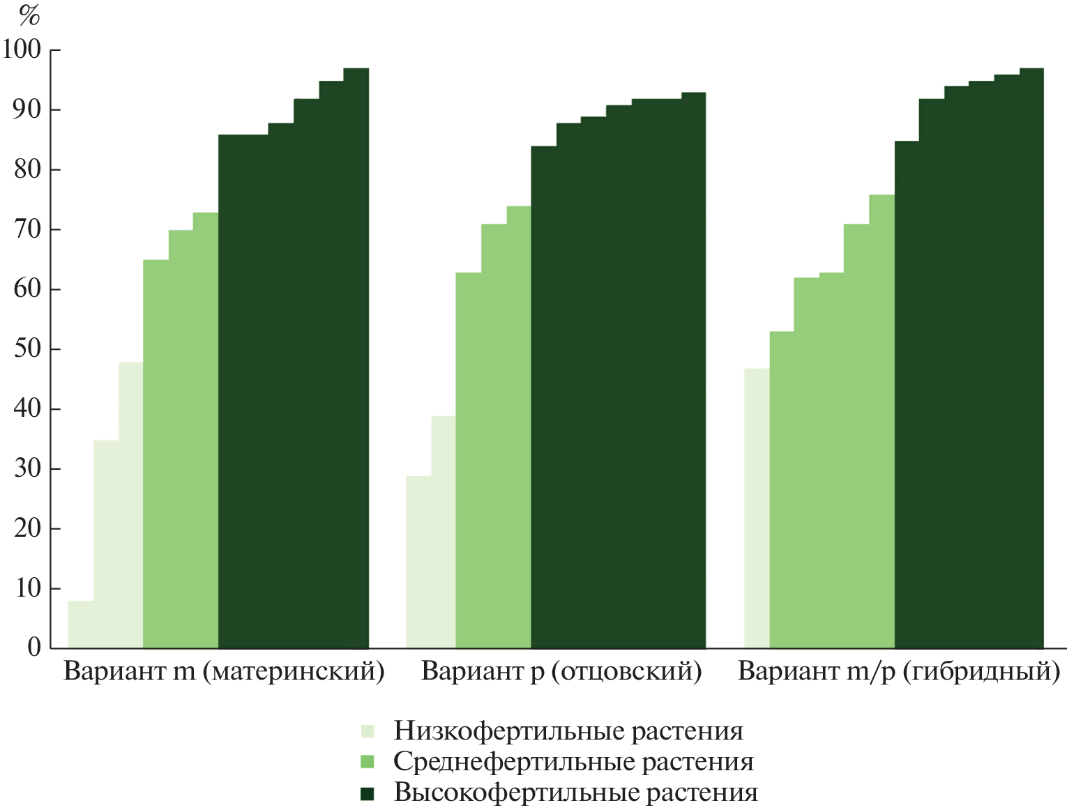 В группе сцепления 13 генома культурного подсолнечника Helianthus annuus L. картирован ряд генов, контролирующих ценные для селекции признаки: восстановление фертильности пыльцы при цитоплазматической мужской стерильности, устойчивость к грибным болезням (ложной мучнистой росе, ржавчине), которые были интрогрессированы от диких видов. Известно, что у подсолнечника и других растений частота рекомбинации в районах хромосом, содержащих интрогрессированные гены устойчивости, может быть подавлена, что благоприятно для проведения отбора с помощью сцепленных с ними молекулярных маркеров. В F2 гибридов от скрещиваний стерильной линии подсолнечника ВИР 116А (ЦМС РЕТ1) с линиями – восстановителями фертильности пыльцы из коллекции ВИР изучили характер совместного наследования локуса Rf1 (фенотипический маркер – признак восстановления фертильности) и Pl5/Pl8, контролирующего устойчивость к большому числу рас Plasmopara halstedii (Farl) Berl. & De Toni (STS-маркер Нa-Р1). В скрещивании ВИР 116А × ВИР 740 частота рекомбинации между локусами Pl5/Pl8 и Rf1 составила 8.61, а в скрещиваниях ВИР 116А × ВИР 195 и ВИР 116А × RIL 80 оказалась почти вдвое выше. Во всех изученных популяциях F2 отмечено отсутствие рекомбинантного фенотипического класса стерильных растений с отцовским вариантом маркера Нa-Р1. При цитологическом анализе установлено, что показатели фертильности пыльцы растений с разными аллелями маркера, скорее всего, определяются генотипом растения, а не аллельным составом мужского гаметофита. Предположили, что нехватка одного из рекомбинантных классов F2 может быть связана с эмбриональной летальностью, т.е. гибелью зигот, несущих рецессивный аллель гена восстановления фертильности пыльцы rf1 и аллельный вариант STS-маркера Ha-P1 гена устойчивости (чувствительности) в локусе Pl5Pl8, полученный от отцовского родителя.