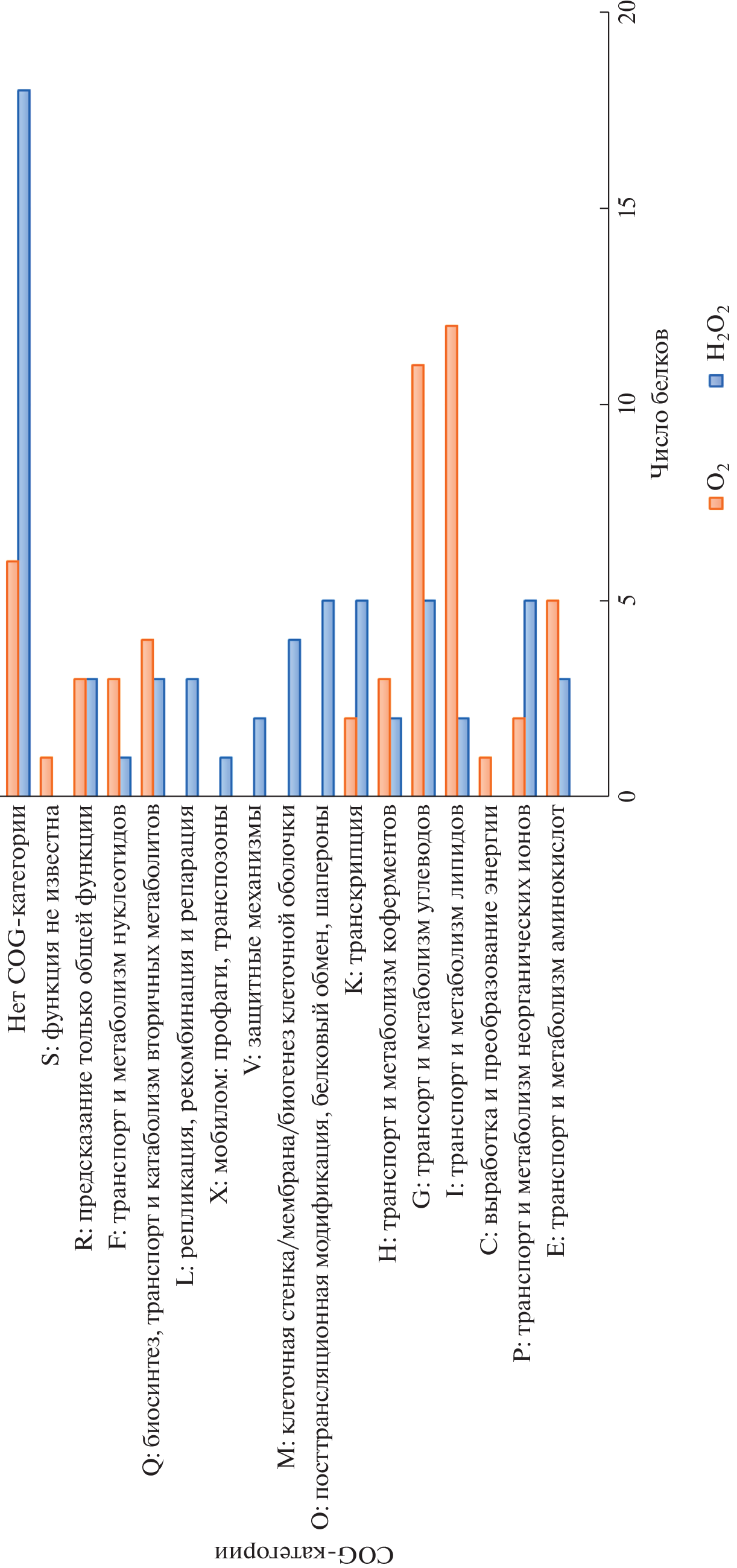 Levilactobacillus brevis 47f – гетероферментативная аэротолерантная молочнокислая бактерия, выделенная из микробиоты желудочно-кишечного тракта здорового человека. В комплексе доклинических исследований штамм проявил противовоспалительные свойства в отношении мукозита слизистой оболочки тонкого и толстого кишечника, индуцированного 5-фторурацилом. Вместе с тем молекулярные механизмы, определяющие свойства штамма и, в частности, его реакцию на воздействие активных форм кислорода, остаются неизученными. Задачей данной работы было исследовать реакцию штамма на действие окислителей – перекиси водорода и кислорода – методом транскрипционного RNAseq-анализа. Оба окислителя оказали сильное действие на штамм, увеличивая или снижая экспрессию нескольких сот генов – как общих, так и специфических для каждого оксиданта. Приведена характеристика белков с наиболее увеличенной экспрессией (ДЭ ≥ 5). Гены, активизирующиеся при действии обоих оксидантов, кодируют белки стресса, антиоксидантной защиты, репарации белков и нуклеотидов, клеточной стенки, транспорта и метаболизма углеводов, катаболических путей запасания энергии. При действии перекиси активизируется транскрипция в основном белков защиты: стрессового ответа и молекулярных шаперонов, антиоксидантной активности, репарации ДНК, а также белков, участвующих в формировании клеточной стенки. В аэробных условиях в значительной степени активизируются гены, определяющие белки преобразования энергии (использование в качестве источника энергии, помимо глюкозы, фруктозы, жирных кислот, нуклеозидов; белки фосфокетолазного пути) и импорта пептидов, аминокислот, сахаров. Полученные в настоящей работе результаты будут использованы нами при интегрированном анализе совокупности транскриптомных, протеомных и метаболомных данных по данному штамму. Это внесет значительный вклад в создание на основе L. brevis 47f фармабиотика для лечения различных воспалительных заболеваний.