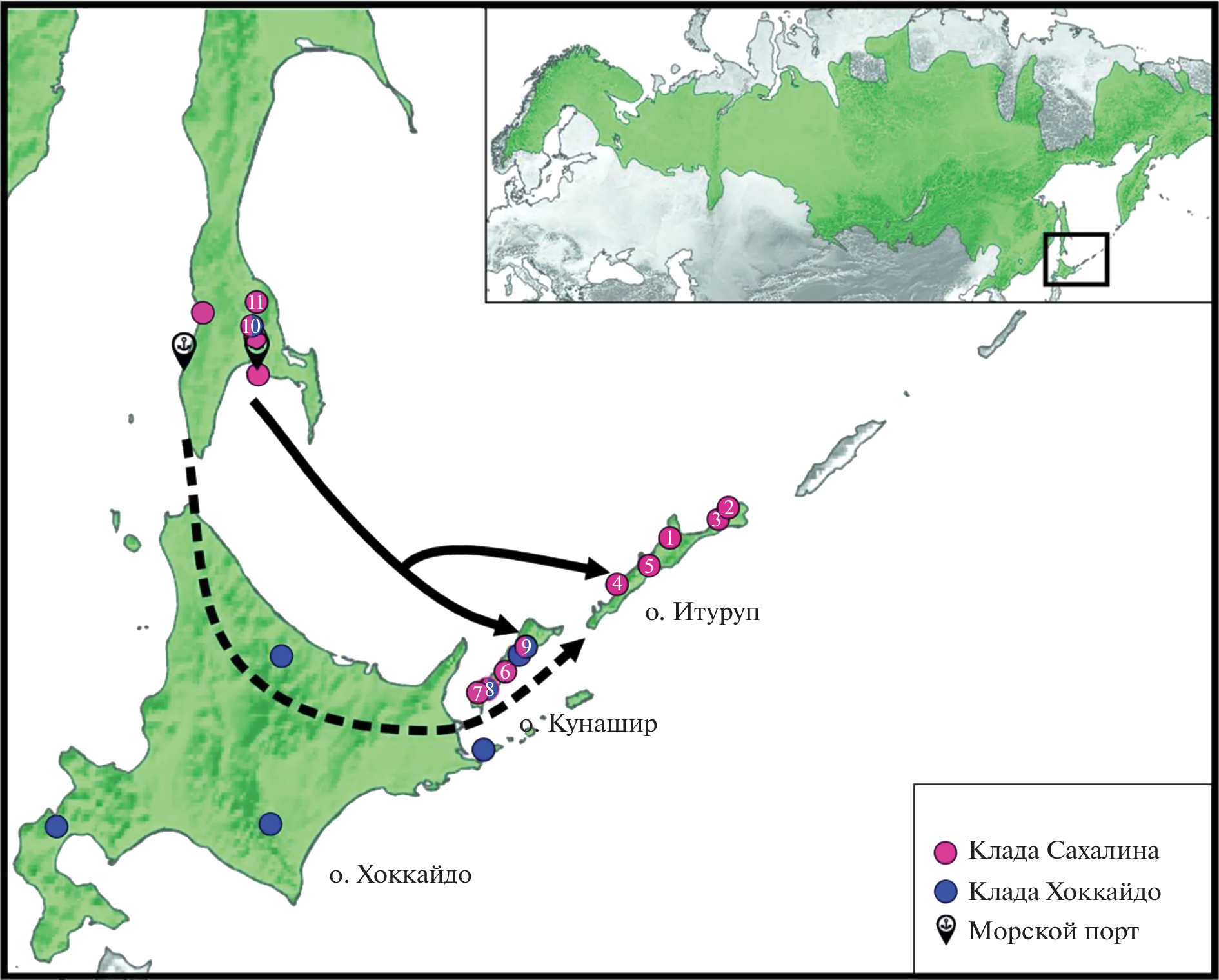 The hypotheses on colonization history of red-backed vole of Iturup Island comparative analysis of distribution and number of haplotypes of mitochondrial cytochrome b gene (662 bp) in vole sampled at various sites along the Iturup Island perimeter and Hokkaido, Kunashir and Sakhalin Islands and adjacent regions of the mainlandhas been carried out. All studied samples from the Iturup Island (68) belonged to the only one haplotype most close to the haplotypes of voles from the Sakhalin Island. The only sample from the Kunashir Island, nearest to the Iturup Island possessed the same haplotype, three additional samples from this island have haplotypes related to haplotypes of voles from the Sakhalin Island and fall within the so called “Sakhalin” clade, while the majority of haplotypes of voles from the Kunashir Island appeared to be close to haplotypes of voles from the Hokkaido Island and make up with them one independent clade, genetically very different from clade of Sakhalin and Iturup samples. The obtained data on the genetic variability of voles from the Iturup Island provides convincing evidence in favour of the recent introduction of the red-backed vole C. rufocanus to the Iturup Island, most likely with sea transport from Sakhalin.