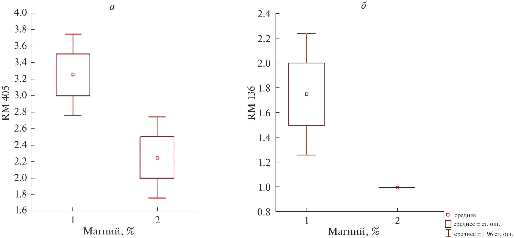 There has been a wide variation in the content of micro and macro elements, both between subspecies and within rice species and varieties. Magnesium as a cofactor is involved in more than 300 enzymatic reactions and is necessary for growth and development of both plants and humans. It affects carbohydrate and protein metabolism. Both adenosine triphosphate (ATP) production, nucleotide and glucose synthesis, and lipid oxidation regulation depend on its concentration. Calcium is also essential for the formation of cell wall structure and cell division. High concentrations of calcium change the composition and condition of red blood cell membranes and cell morphological characteristics. At the same time the variability in signs of domestic rice varieties has not yet been studied. There have been no studies on the localization of chromosomal regions responsible for the formation of traits of magnesium and calcium content in rice samples. Wide variation in calcium content (0.07–2.33%) and magnesium content in rice samples (2–14%) was established. Contrasting groups of varieties and sources by signs were identified. A search for chromosomal regions determining the quality of domestic samples was carried out using 58 molecular markers distributed across the rice genome (SSR). The data on phenotyping of native rice varieties by quality signs were used to divide them into groups with maximum trait value (1) and minimum trait value (2). The relationship between phenotypic manifestation of the trait and the genotype of the sample was established: by means of analysis of variance. Eight loci determining magnesium and calcium content in native rice varieties – were identified. The loci determining magnesium content are located on chromosomes 5, 6, 7, 8. Four loci associated with calcium content were identified two on the second chromosome and one each on the eighth and fifth chromosomes. On the fifth chromosome, it is located (RM 13, 28.6 cM) in close proximity to the RM 405 marker region (28 cM), which is connected with magnesium content.