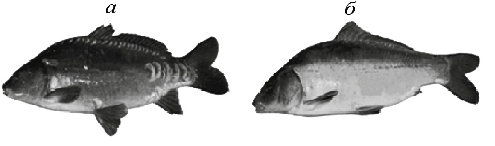 Рис. 1. Двухлетки карпа из кросса N × МР с разбросанным чешуйным покровом (а) и бесчешуйные (голые) (б).