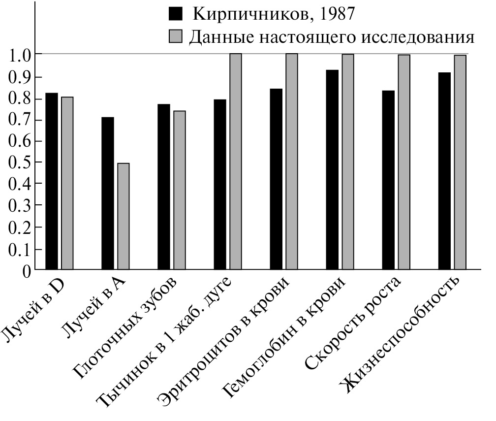 Рис. 2. Отношение величин различных признаков у голых карпов к соответствующим значениям у разбросанных карпов по литературным данным [4] и данным настоящей работы.