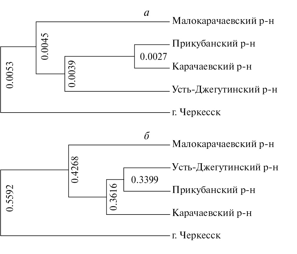 Мы предполагаем, что это связано с более высоким уровнем метисации карачаевцев Черкесска. Интенсивность метисации карачаевцев в Черкесске составляет 41.3, в районах – 11.7%. Эндогамность районов не является высокой (0.29‒0.53), это позволило нам определить территорию фактического проживания карачаевцев как элементарную популяцию, что допускает произвольное сочетание между подгруппами при кластеризации по различным генетическим системам [26].