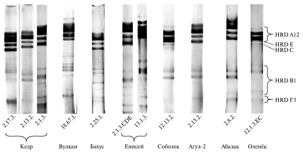 Электрофорез гордеинов проводили в 13%-ном крахмальном геле в присутствии 3 М мочевины [6, 7]. Электрофоретические спектры записывали в виде генетических формул (HRD A.B.F.) согласно каталогу блоков компонентов гордеинов [5, 7].