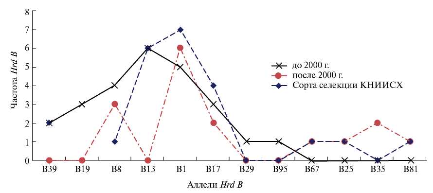 Рис. 2. Распределение частот встречаемости аллелей локуса Hrd B в группах сортов, районированных и допущенных к использованию в Красноярском крае.