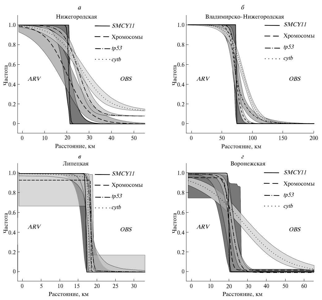 Анализ клинальной генетической изменчивости по cytb, tp53, SMCY11 и хромосомам на “нижегородской”, “владимирско-нижегородской” и “воронежской” трансектах (рис. 3, табл. 3) показал, что клина по cytb самая широкая, клина по SMCY11 – самая узкая, а клина по tp53 занимает промежуточное положение между ними. Различия по ширине между клиной по cytb и клинами по tp53 и SMCY11 на трех вышеназванных трансектах достоверны (доверительные интервалы не перекрываются). Центр клины по cytb на “владимирско-нижегородской” и “воронежской” трансектах достоверно смещен относительно центров клин по tp53, SMCY11 и центра хромосомной клины в сторону ареала M. obscurus; на “нижегородской” трансекте смещение центра клины по cytb относительно центров клины по SMCY11 и хромосомной клины достоверно, а относительно центра клины по tp53 недостоверно (табл. 3).