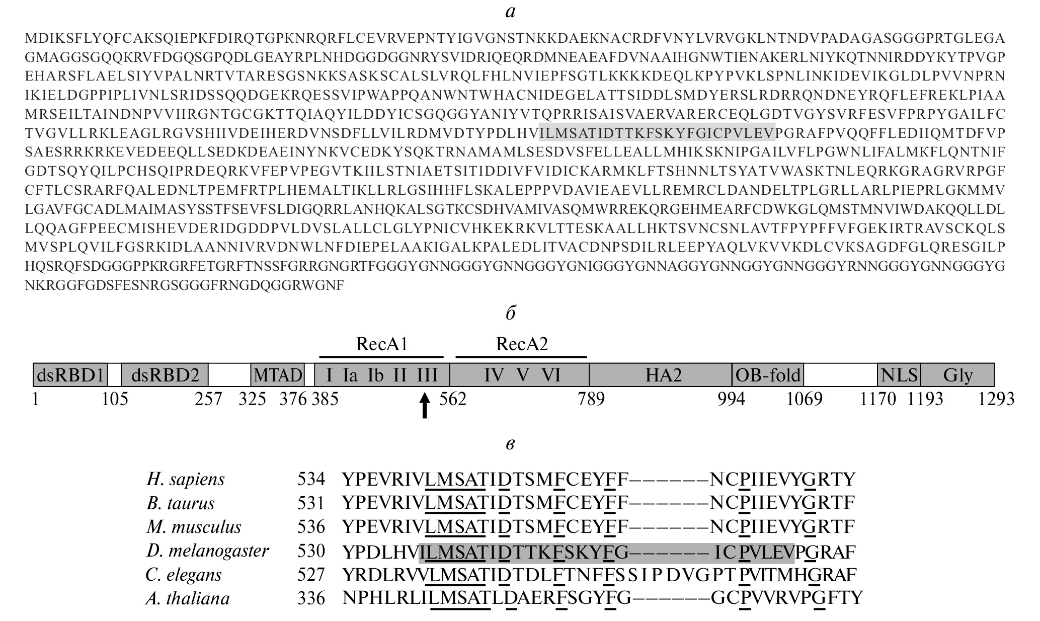 Рис. 2. Строение белка MLE в мутантах mle[9]. а – аминокислотная последовательность белка MLE. Делеция выделена серым цветом; б – доменное строение MLE (цит. по [7] с изменениями). Районы, соответствующие определенным доменам, обозначены серым цветом, линкерные участки – белым цветом. Представлены два домена связывания дцРНК – dsRBD1 и dsRBD2, минимальный домен трансактивации MTAD, каталитическое “ядро”, состоящее из доменов RecA1 и RecA2 и хеликаза-ассоциированного домена HA2, область связывания олигосахарида/олигонуклеотида OB-fold, сигнал ядерной локализации NLS, глицин-богатый С-концевой домен Gly. Консервативные мотивы обозначены римскими цифрами, положение делеции обозначено черной стрелкой; в – выравнивание последовательности, содержащей мотив III, у представителей разных видов. Подобные у разных видов а.о. выделены жирным шрифтом, идентичные а.о. выделены жирным шрифтом и подчеркнуты. Делеция mle[9] выделена серым цветом.
