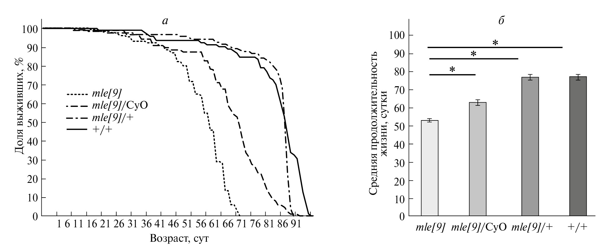 Рис. 4. Мутация mle[9] в гомозиготном состоянии снижает продолжительность жизни самок. а – кривые выживания при температуре 24°С. mle[9] – гомозиготные самки, mle[9]/CyO и mle[9]/+ – гетерозиготные самки с загнутыми и c прямыми крыльями соответственно, +/+ – самки линии Oregon R; б – средняя продолжительность жизни. Планки погрешностей обозначают стандартную ошибку среднего, * – р < 0.001.
