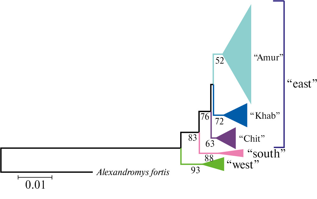 Несмотря на то, что полевка Максимовича достаточно часто была включена в филогенетические анализы рода [2, 5, 18], внутривидовая генетическая структура исследована недостаточно. Наиболее детальный филогеографический анализ проведен для среднего Приамурья, где было обнаружено две филогенетические линии с зоной контакта в междуречье рек Биры и Биджана [19]. Тогда как обширная территория, от Байкала до слияния рек Зея и Амур, осталась не охваченной (ранее с этой территории исследовано не более 20 особей).