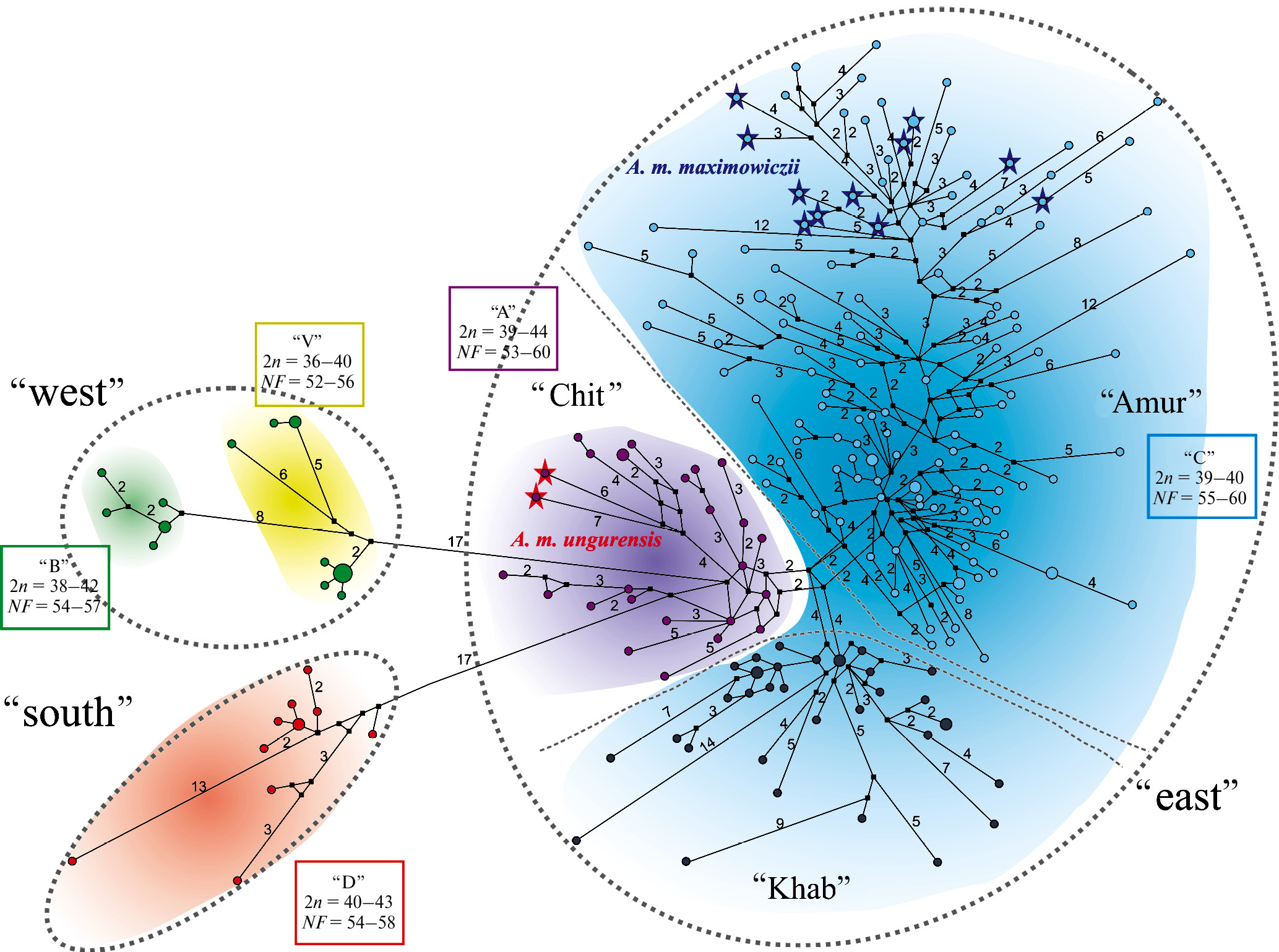 Для полевки Максимовича, как и для других представителей надвида “maximowiczii”, отмечен чрезвычайно сложный хромосомный полиморфизм [8, 14–17]. Диплоидные числа варьируют от 36 до 44 за счет структурных перестроек хромосом, включающих как тандемные, так и центромерные слияния. Помимо этого, увеличение числа двуплечих хромосом происходит и в результате инверсий/смещений центромер [8, 15]. В результате множественных перестроек число плеч хромосом варьирует от 52 до 62 [17]. На основании хромосомных характеристик – 2n и NF, полевок из различных географических регионов в Забайкалье и Монголии было выделено пять хромосомных форм (рис. 1) [15]. Хромосомная форма “А” – из Северного и Центрального Забайкалья, имела максимальные диплоидные числа хромосом (2n = 39–44, NF = 53–62). Хромосомная форма “B” – из северо-восточного Забайкалья: низовья р. Селенга и средней части р. Онон – средние диплоидные числа хромосом (2n = 38–42, NF = 54–57). Хромосомная форма “V” – со склонов Хэнтейских гор в Монголии – минимальные (2n = 36–40, NF = 52–56). Позже хромосомные характеристики форм “А” и “В” были нами дополнены, а также было выделено еще две хромосомные формы, в Забайкалье и на юге Дальнего Востока России [17]: “D” из Юго-Восточного Забайкалья и Восточной Монголии (2n = 40–43, NF = 54–58) и “C” с территории юга Дальнего Востока России, верхнего и среднего Амура (2n = 39–42, NF = 55–60).