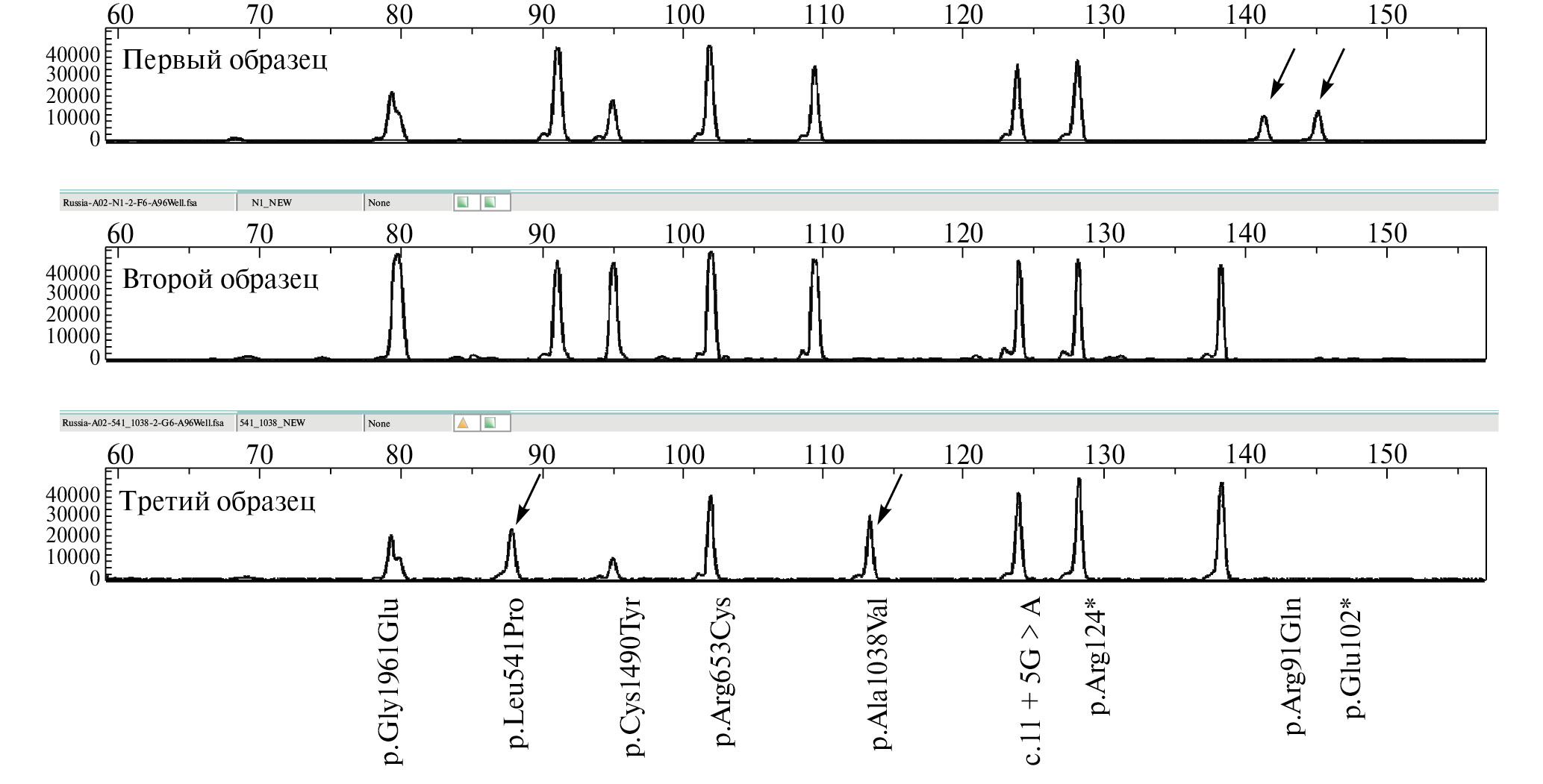 Рис. 1. Визуализация результатов фрагментарного анализа ПЦР-продуктов MLPA-систем детекции частых вариантов в генах ABCA4 и RPE65. Первый образец: в гене RPE65 обнаружены варианты p.Arg91Gln и p.Glu102* в гетерозиготном состоянии; второй образец – норма; третий образец: в гене ABCA4 обнаружен комплексный аллель p.[Leu541Pro;Ala1038Val] в гомо-/гемизиготном состоянии.