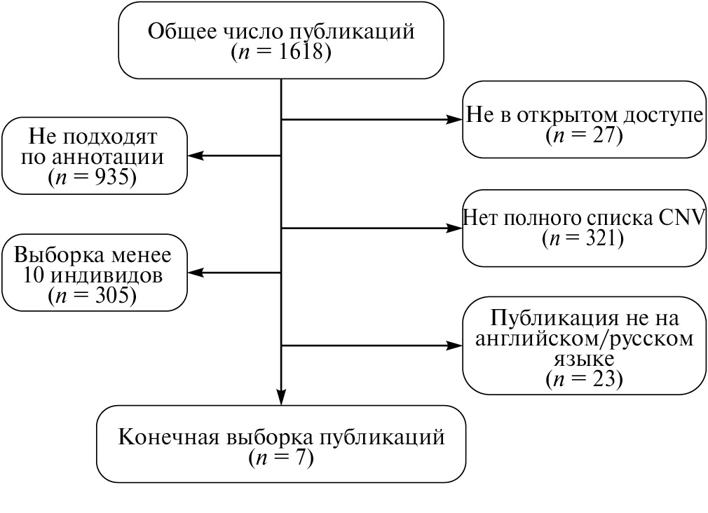 Настоящее исследование выполнено в соответствии с рекомендациями PRISMA [11] и представляет собой анализ публикаций, посвященных CNV при НПР и также находящихся в открытом доступе в базе NCBI PubMed [12]. Поиск статей проводился с использованием двух вариантов запросов – “neurodevelopmental disorders, copy number variation” (n = 1410) и “neurodevelopmental disorders, aCGH” (n = 208). Всего обнаружено 1618 публикаций. Далее проводился отбор публикаций с использованием следующих критериев включения: