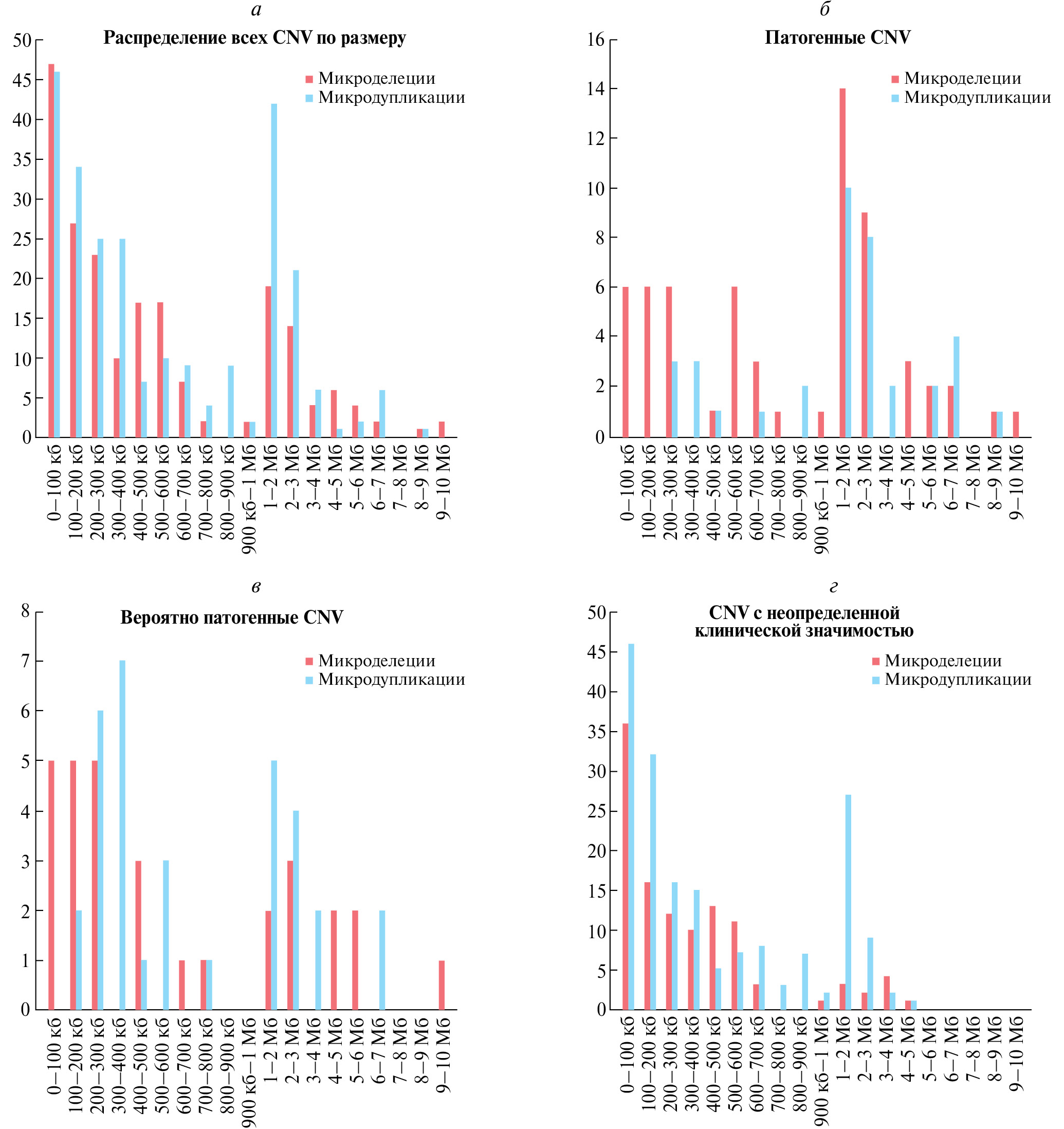 Обзор представляет собой комплексный анализ вариаций числа копий участков ДНК (CNV), обнаруженных у пациентов с нарушениями психомоторного развития (НПР) и опубликованных в мировой литературе, с применением специально разработанных критериев отбора. CNV охарактеризованы в отношении клинической значимости, типа изменения копийности (микроделеции/микродупликации), размера, происхождения и вовлеченных генов. Исследуемая выборка включала 3375 пациентов с НПР, среди которых патогенные и вероятно патогенные CNV, а также варианты с неопределенной клинической значимостью были обнаружены у 395 индивидов (12%). Хромосомные варианты из каждой категории выявлены у 89 (3%), 56 (2%) и 241 (7%) пациентов соответственно. Девять индивидов имели комбинации CNV разной клинической значимости. Количество микродупликаций незначительно преобладает над числом микроделеций (250 и 204 соответственно). Размер большей части CNV варьировал в диапазоне от 193 пар нуклеотидов до 400 кб и от 1 до 3 Мб (237 и 96 соответственно). 72 варианта возникли de novo, 165 были унаследованы. 87 CNV ассоциированы с 33 известными микроделеционными/микродупликационными синдромами. Наиболее часто встречались синдромы микродупликации 1q21.1 (7/395, 1.8%) (OMIM:612475), микроделеции 2p16.3 (9/395, 2.3%) (OMIM:614332), микроделеции 15q13.3 (7/395, 1.8%) (OMIM:612001), микроделеции 16p11.2 (9/395, 2.3%) (OMIM:611913) и микродупликации 22q11.2 (7/395, 1.8%) (OMIM:608363). В результате анализа обогащения было установлено, что патогенные CNV, как и варианты с неопределенной клинической значимостью, обогащены генами, ассоциированными с аномальным поведенческим/неврологическим фенотипом. Вероятно патогенные CNV включали гены, связанные с нарушениями нервной системы, а также гомеостаза/метаболизма.