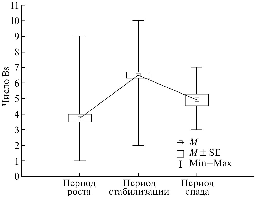 Наблюдения за мышами из популяции северного региона Прителецкой тайги после 2008 г. показали стабилизацию кариотипа (рис. 1). Рассматривая всю динамику за 36 лет, можно выделить три временных периода. С 1978 по 2002 гг. (24 года) – период устойчивого роста числа В-хромосом, с относительно равномерным средним увеличением на 1.4 хромосомы в десятилетие (с 3.17 ± 0.2 до 6.5 ± 0.54). Отличия средних между периодами начала роста (1978–1980 гг.) и конца роста (2002 г.) достоверны при p = 0.0000001. Период стабилизации, продолжавшийся после 2002, до 2012, на более чем двукратно высоком уровне, по сравнению с началом 1980-х годов. И третий период (после 2012 г.) ‒ наметившаяся тенденция к снижению числа дополнительных хромосом (4.91 ± 0.36). Изменения среднего числа Bs и их минимальных и максимальных показателей в разные периоды динамики показаны на рис. 2. Различия среднего числа Bs между разными периодами достоверны: между периодом роста и периодом стабилизации (p = 0,00000000000001), между периодом стабилизации и периодом спада (p = 0.0069).