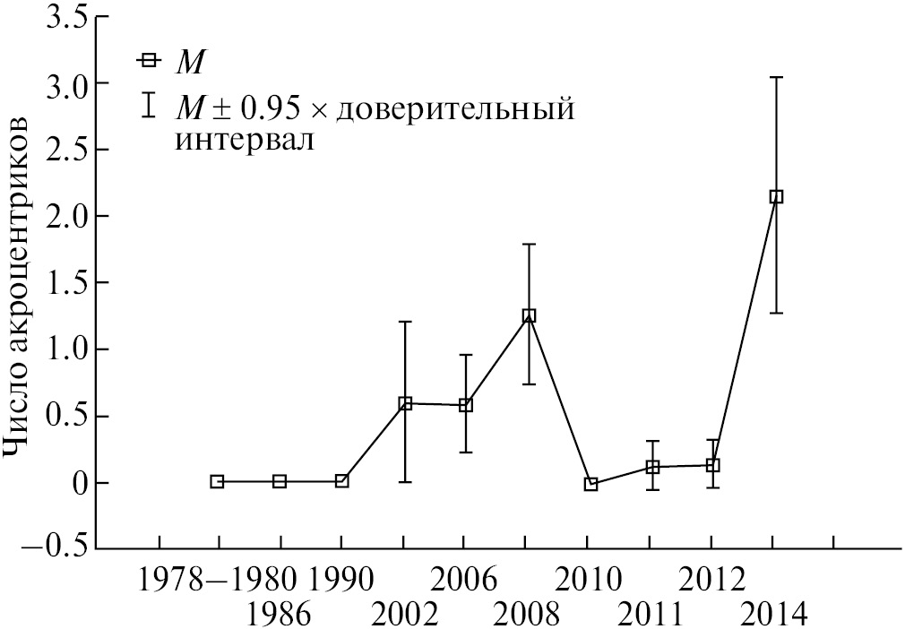 Рис. 8. Динамика среднего числа (M) микро-B-хромосом (V класса Bs) у A. peninsulae в популяции северного региона Прителецкой тайги Горного Алтая в 1978–2014 гг.