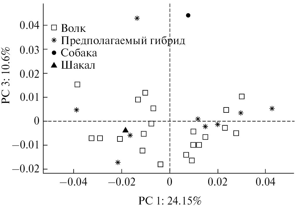 По результатам второго анализа (рис. 2) наблюдалось удаление черепа шакала от остальных черепов по комбинации первой и второй компонент (24.15% и 18.77% изменчивости соответственно). При этом ни один из черепов предполагаемых гибридов не был ближе к черепу шакала, чем к какому-либо из черепов волков. По третьей компоненте (10.6% изменчивости) наблюдалось значительное удаление черепа собаки и одного из черепов предполагаемых гибридов (череп 02-2021).