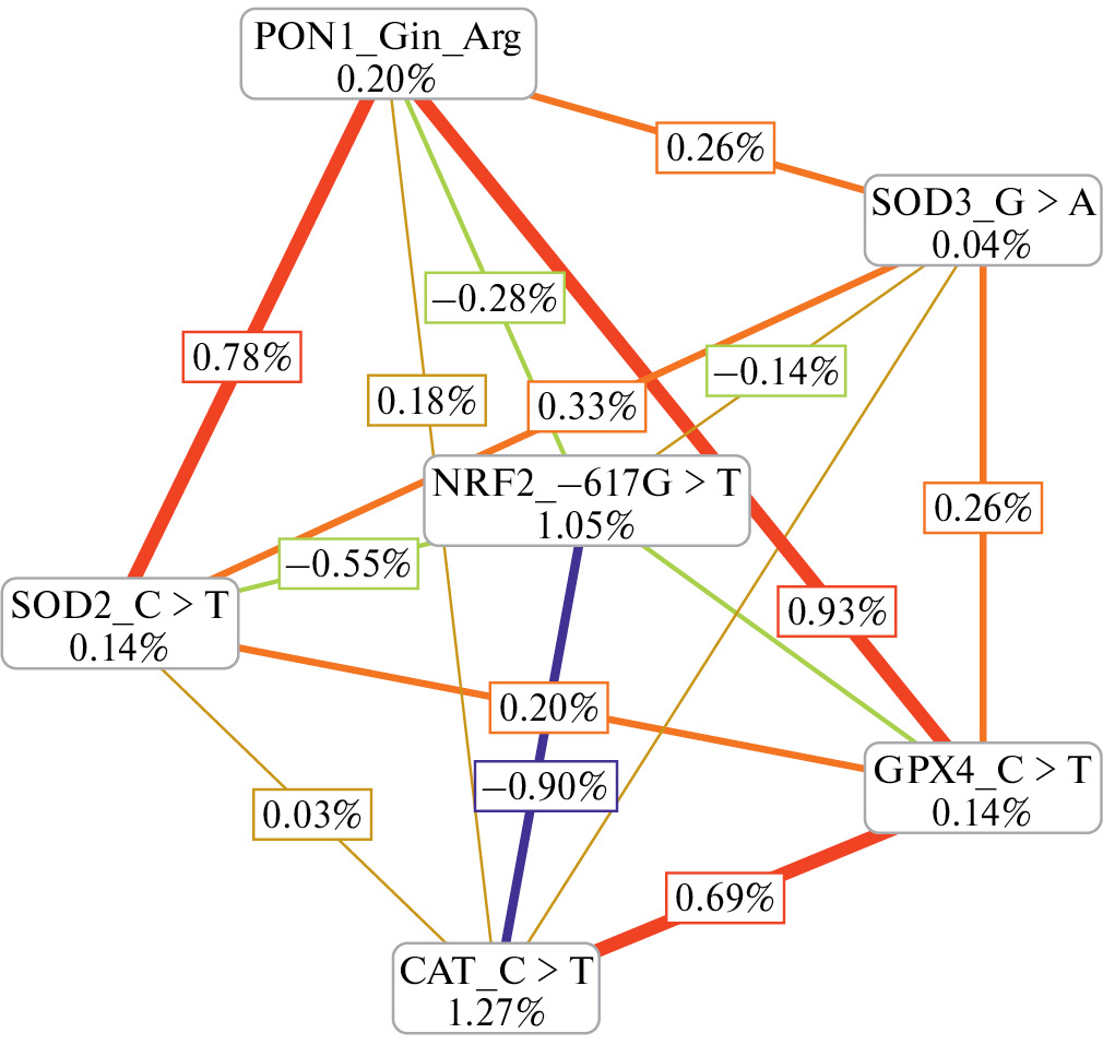 На рис. 1 представлен характер взаимодействия между исследуемыми локусами. Выявлен эффект синергизма между локусами PON1 и SOD2, PON1 и GPX4, GPX4 и CAT.