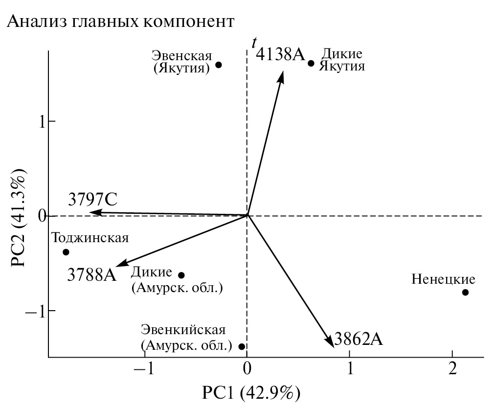 Анализ главных компонент (рис. 2) показывает, что ненецкая порода оленей и тоджинский экотип отличаются от остальных выборок по полиморфизмам в сайтах 3788 и 3797 (коэф. корреляции r(C) = −0,91, p = 0.012), у ненецкой породы в данных позициях доли минорного аллеля превышают 0.2, в то время как у тоджинских оленей минорный вариант T в позиции 3797 отсутствует. По второй главной компоненте, объясняющей 41.3% дисперсии, обосабливаются от остальных домашние эвенские и дикие олени из Якутии. Их объединяет отсутствие минорных гомозигот и низкая частота минорного аллеля в позициях 3862 (r(A) = 0.83, p = 0.044) и 4138 (r(A) = −0.92, p = 0.008).