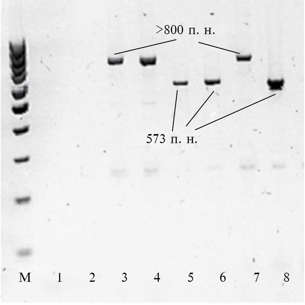 Рис. 1. Электрофорез продуктов амплификации фрагмента гена ToxA штаммов P. tritici-repentis со специфичными праймерами. М – маркер длин фрагментов GeneRuler 100 bp; 1, 2 – негативный контроль; 3 – штамм Каз20-С-12; 4 – Каз22-C-А-53, 7 – Каз22-C-А-64, 5, 6 и 8 – штаммы P. tritici-repentis из популяции Каз22-С.