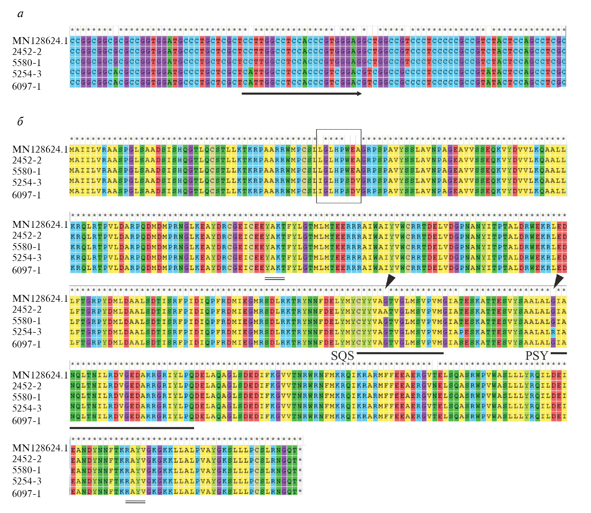 Рис. 1. Выравнивание участка кДНК ZmPSY1 (а) и аминокислотной последовательности гомологов ZmPSY1 (б) у двух желтозерных (2452-2, 5580-1) и двух белозерных (5254-3, 6097-1) инбредных линий кукурузы в сравнении с референсом Z. mays var. B73 (LOC100136882; MN128624.1). Стрелкой указан участок нуклеотидной последовательности, выбранный для прямого праймера (на анализ аллельного варианта гена ZmPSY1). В аминокислотной последовательности выделен рамкой полиморфный участок транзитного пептида, содержащий замещения ао L47I, W52S, E53D и A54V, подчеркнуты консенсусы SQS и PSY (сплошными линиями) и участки YAKTF и RAYV, ограничивающие каталитически активный сайт (двойными линиями), а также указаны радикальные замещения ао (стрелками).