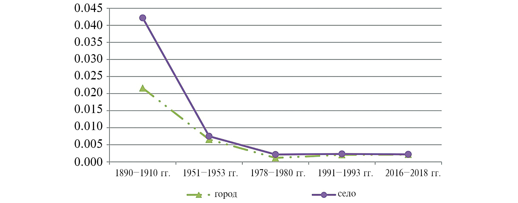 Реверсивной динамикой характеризовался уровень локального инбридинга. Так, если в 1890–1910 гг. значение локального инбридинга в городе было в 19.5 раз выше, чем в селе, то к 2016–2018 гг. показатель локального инбридинга стал в 3 раза выше в селе по сравнению с городом. При этом для городской части популяции наблюдалось стабильно выраженное снижение данного показателя (в 78 раз) в течение всего периода, тогда как в сельской части наблюдалась вариабельность по пяти периодам при уменьшении за 130 лет лишь в 1.3 раза (рис. 5).