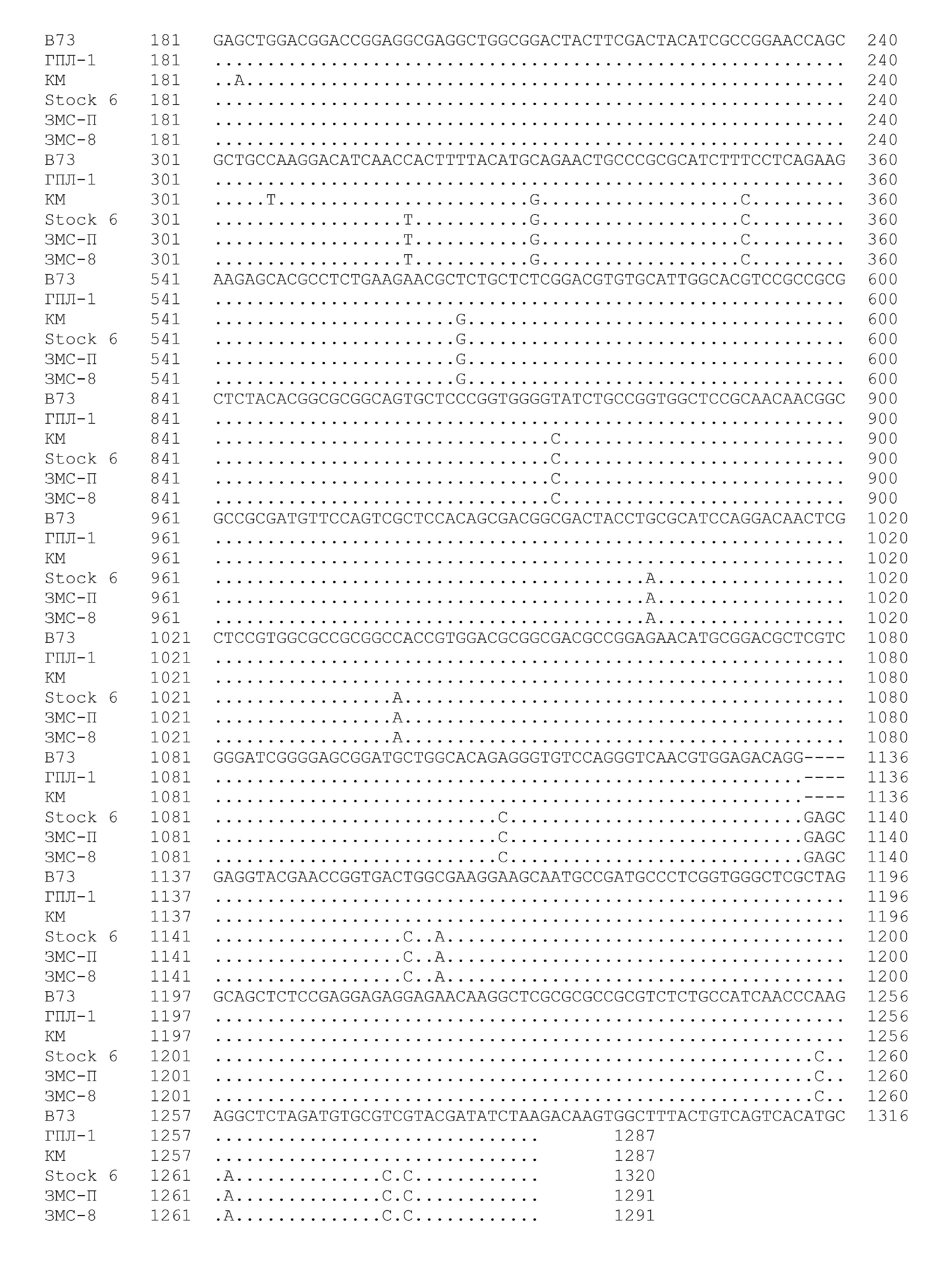 Последовательности гена Zm_Pla1 линий КМ и ГПЛ-1, которые использовались при получении линий ЗМС-8 и ЗМС-П, также не содержали 4-нуклеотидной вставки. У линии КМ обнаружен вариант нуклеотидной последовательности гена Zm_Pla1, содержащий семь ОНЗ. Последовательность гена Zm_Pla1 линии ГПЛ-1 полностью совпадает с последовательностью гена Zm_Pla1 референсной линии В73.