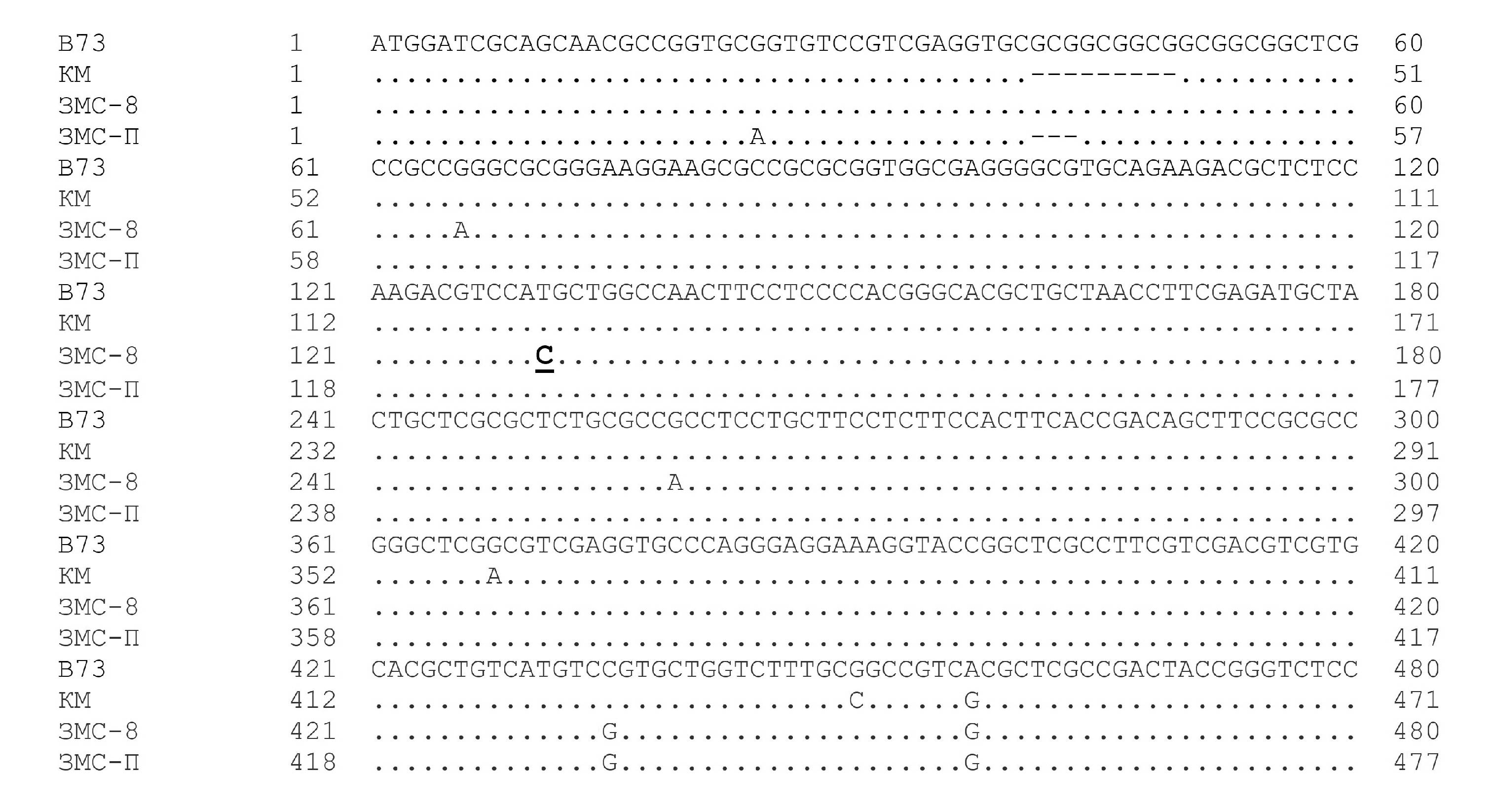 Рис. 2. Множественное выравнивание нуклеотидных последовательностей гена Zm_Dmp7 у линий кукурузы саратовской селекции КМ, ЗМС-8, ЗМС-П и референсной линии B73, выполненное с использованием программы BLAST. Точками показано нуклеотидное сходство последовательностей гена Zm_Dmp7 исследуемых линий с последовательностью гена Zm_Dmp7 референсной линии В73; ОНЗ у линий КМ, ЗМС-8 и ЗМС-П обозначены буквами; дефис означает отсутствие нуклеотида. ОНЗ линии ЗМС-8, совпадающая с ОНЗ линии CAU5, подчеркнута.