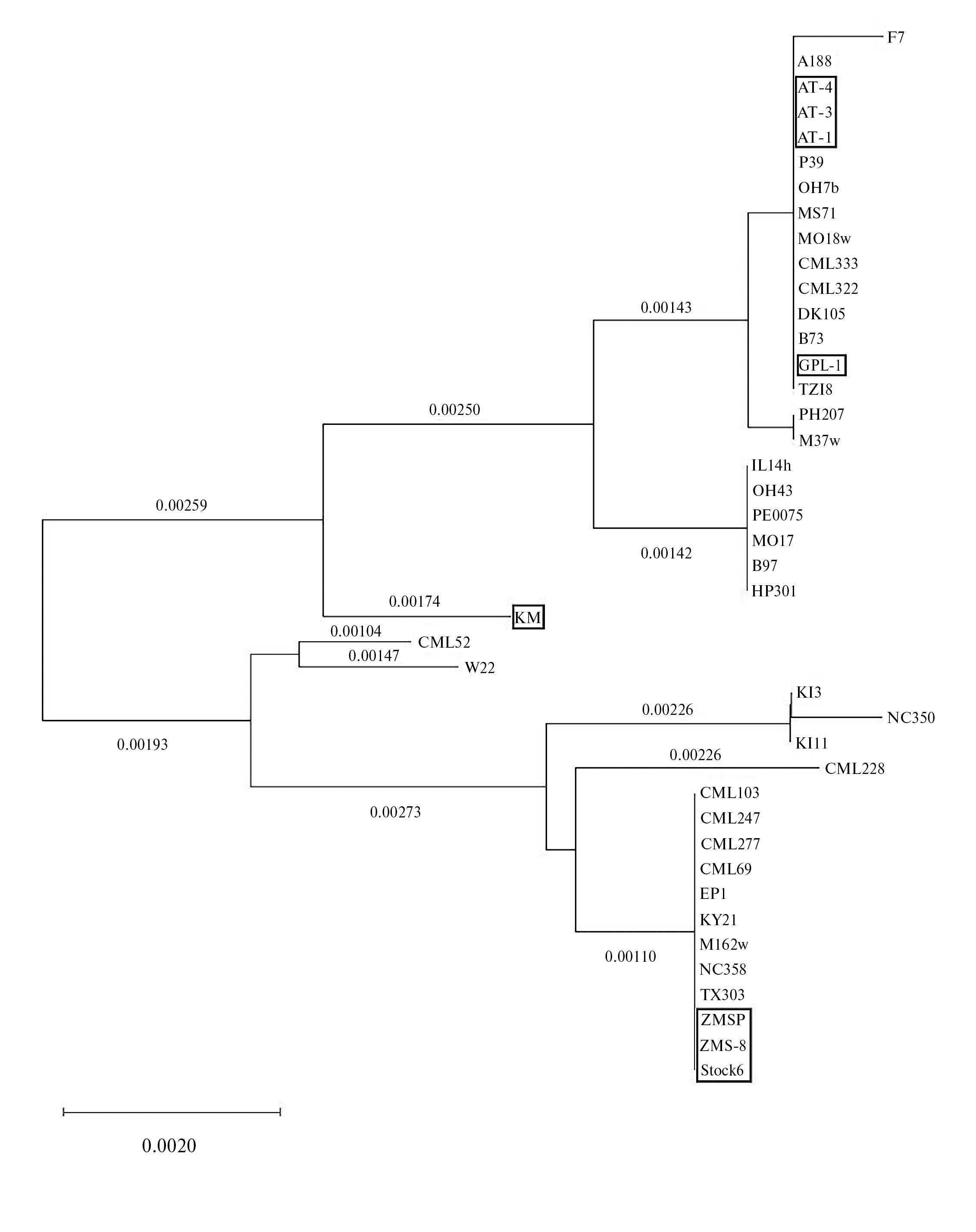 Рис. 3. Филограмма линий кукурузы по гену Zm_Pla1, построенная в программе MEGA 11 [по 16] (обозначения линий даны согласно авторскому оригиналу). Вариант представления с данными эволюционного расстояния для каждой из ветвей; рамками выделены изучаемые линии саратовской селекции.